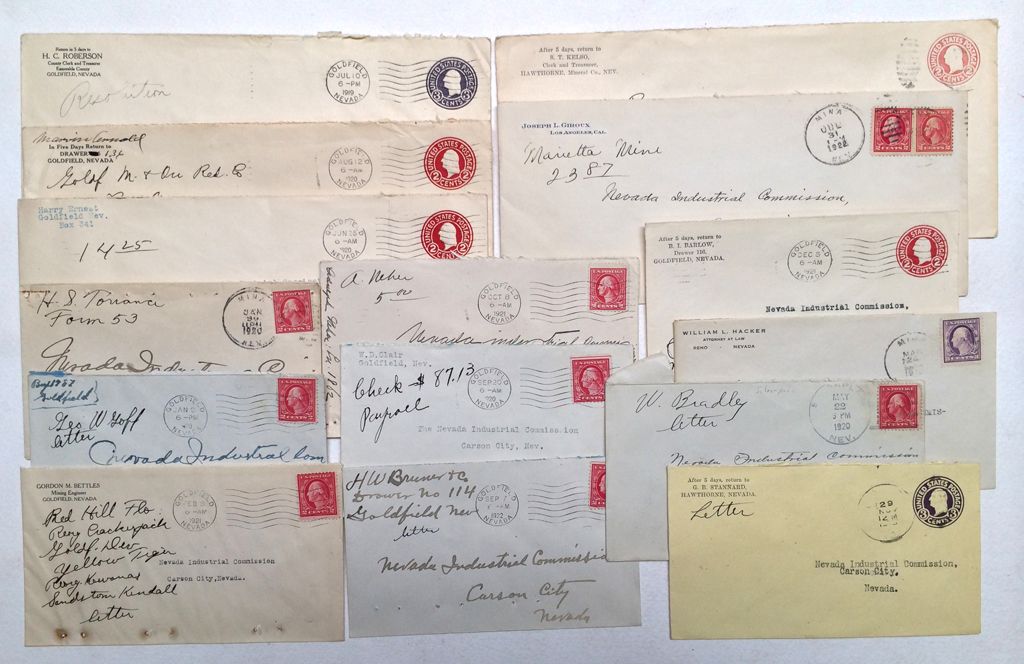 Lot of 15. Post marks include Silver Peak, Mina, Hawthorne, Goldfield. Names include H Roberson, H Ernst, G Goff, G Bettles, H Bruner, B Barlow, W Hacker, S Kelson, Joseph Giroux etc.