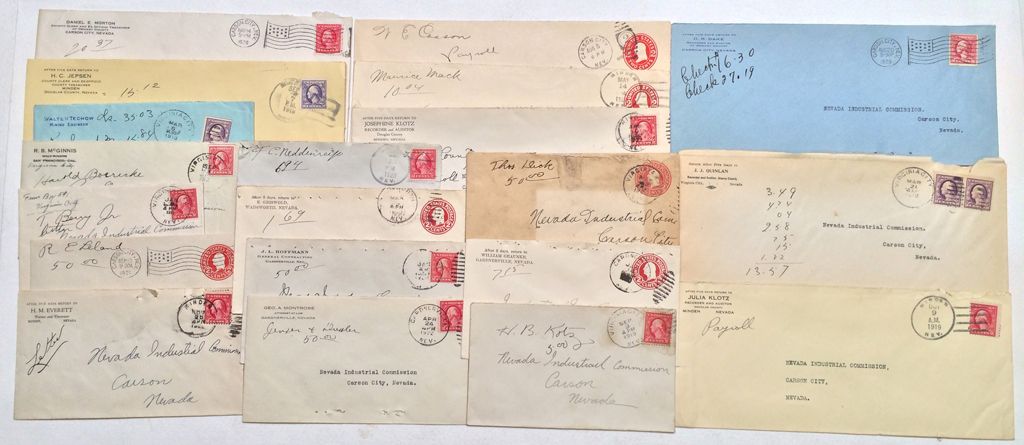 Lot of 20. Cancels include Virginia City, Wadsworth, Hudson (very light), Gardnerville, Minden and Carson City. Names include R Leland, O Dake, J Hoffman, George Montrose, W Graunke, M Mack, H Jepsen, H Everett. E Griswold, Thomas Dick, Walter Techow, etc. From Minden there is Julia Klotz, recorder in 1919 and Josephine Klotz, recorder in 1922. Eugene Griswold owned a general store in Wadsworth. He arrived in Wadsworth with the Central Pacific Railroad.