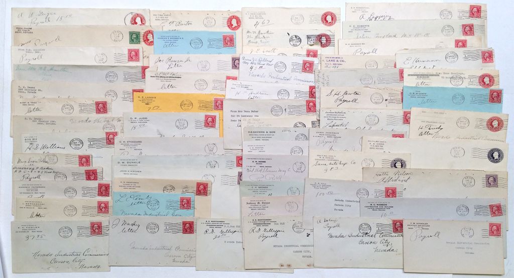 Lot of 59. Includes E Fowler, A Paterson, J Davis, H Williams, S Brady, R Todd, J Mackey, S Montgomery, F Peck, V Scott, J Dillard, H Saviers, A Howe, EE Roberts, H Harrison, E Beemer, H Danforth, H Landis, O McGinty, J Kirchen, A Solari, D Dunkle, A Geiger, C Stoddard, O Judd, etc. Many of these are important Nevada Names. Kirchen was a prominent Nevada engineer who lost his foot at the White Caps Mine in Manhattan in 1918. Judd sold Oakland, Buick, and Lexington cars in 1918. Robert Todd was president of the Star of the West Mining Company.