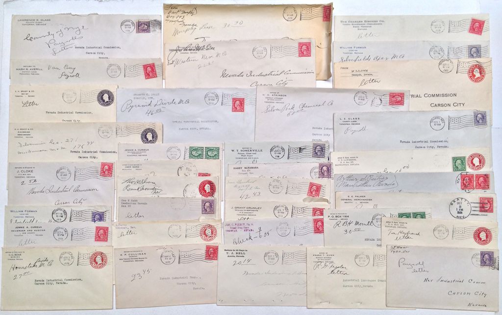 lot of 35. Post marks include Tonopah, Beatty, Manhattan, Round Mountain (very poor). Names include D Murphy, C Kirchen, W Somerville, M Averill, W Forman, Dr. Craig, H Darms, E Cullinan, C Boak, F Dunn, S Brady, J McGee, H Atkinson, J Cloke, L Glass, H McNamara, J Grant Crumley, etc.