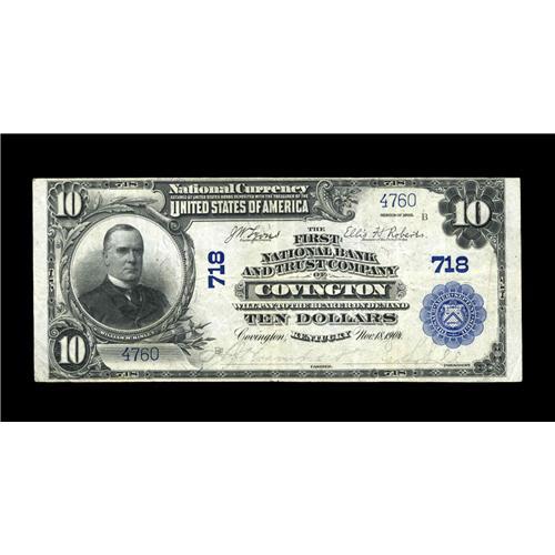 <B>Covington, KY</B></I> - $10 1902 Plain Back Fr. 624 <B>The First NB & TC</B></I> Ch. # 718<BR>This <B>Very Fine</B></I> offering bears the second, and scarcer, of the two titles under which this bank issued. It is one of only five $10 Plain Backs surviving.