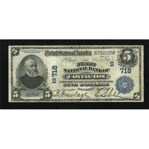 <B>Covington, KY</B></I> - $5 1902 Date Back Fr. 590 <B>The First NB</B></I> Ch. # (S)718<BR> The signatures are bold on this issue which features the first title. <B>Fine.</B></I><BR><BR><b>Shipping:</b> Coins & Currency (<a target="_blank" href="http://www.heritageauctions.com/common/shipping.php">view shipping information</a>)