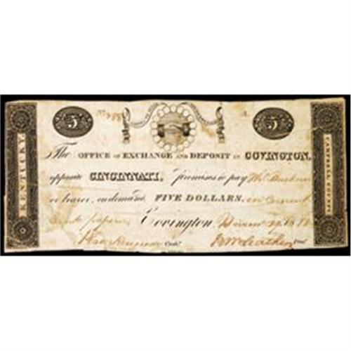 Haxby KY-Not listed. Hughes 156. A very note on Kentucky from this period after the War of 1812. The issuer acted as a bank and used the designation "opposite Cincinnati" to remind note holders they were not in the middle of nowhere. Fully issued, signed and dated 1818. An interesting vignette of clasped hands used on several Kentucky notes and the motto "United We Stand-Divided We Fall". There is some minor foxing, but the condition is sharp for a note of this type and rarity.