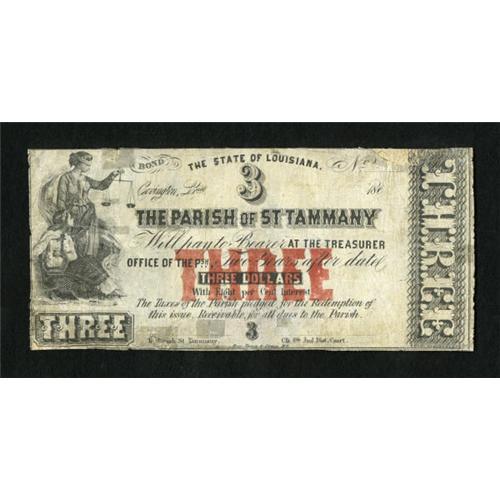<B>Covington, LA- Parish of St. Tammany </B></I>$3 <BR> A bold THREE overprint is noted on the face. There are some minor repairs that are noted most easily on back. <B>Fine.</B></I><BR><I>From The Collection of a Louisiana Gentleman</B></I><BR><BR><b>Shipping:</b> Coins & Currency (<a target="_blank" href="http://www.heritageauctions.com/common/shipping.php">view shipping information</a>)