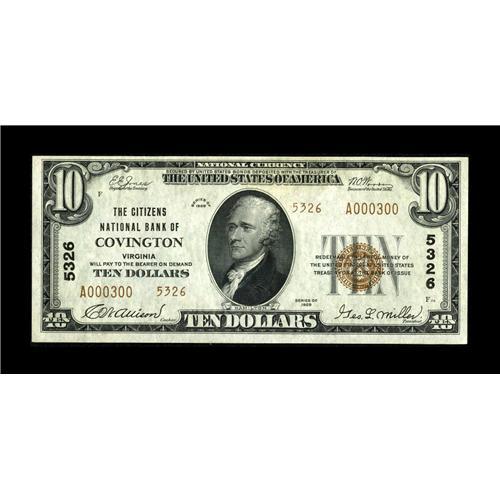 <B>Covington, VA</B></I> - $10 1929 Ty. 2 <B>The Citizens NB</B></I> Ch. # 5326<BR>This is a scarcer bank in small size than large, and this newly discovered piece is by a huge margin the finest known Series 1929 example (with the highest grade now listed Very Fine). <B>Choice Crisp Uncirculated.</B></I><BR><I>From The George P. Hammerly Collection</B></I><BR><BR><b>Shipping:</b> Coin/Currency (<a target="_blank" href="http://www.heritageauctions.com/common/shipping.php">view shipping information</a>)