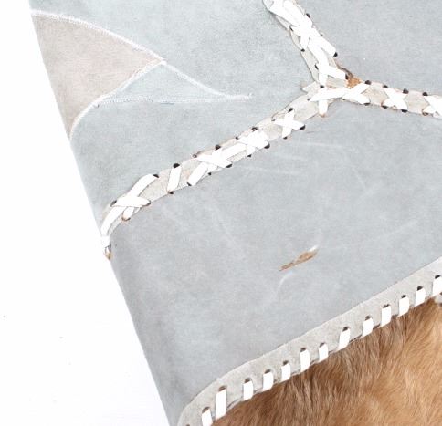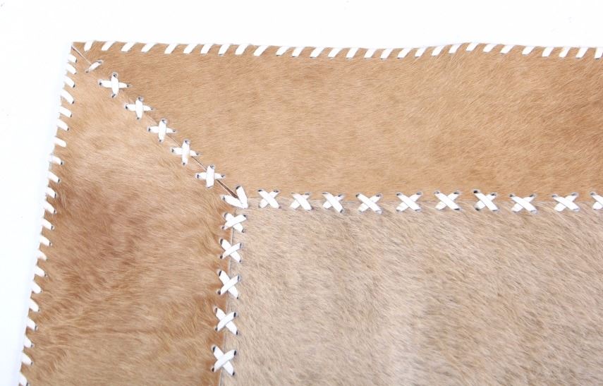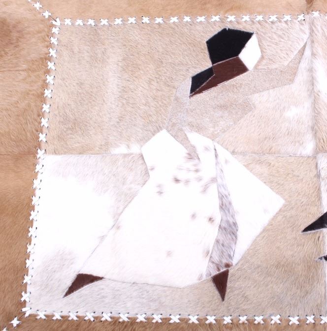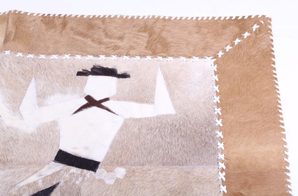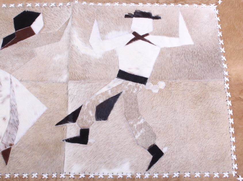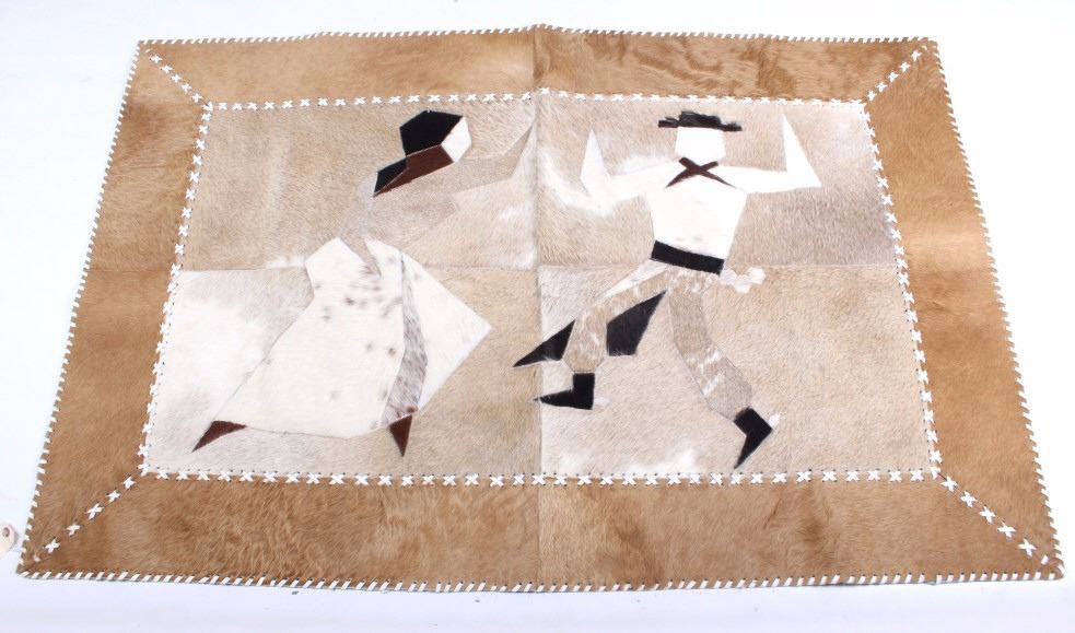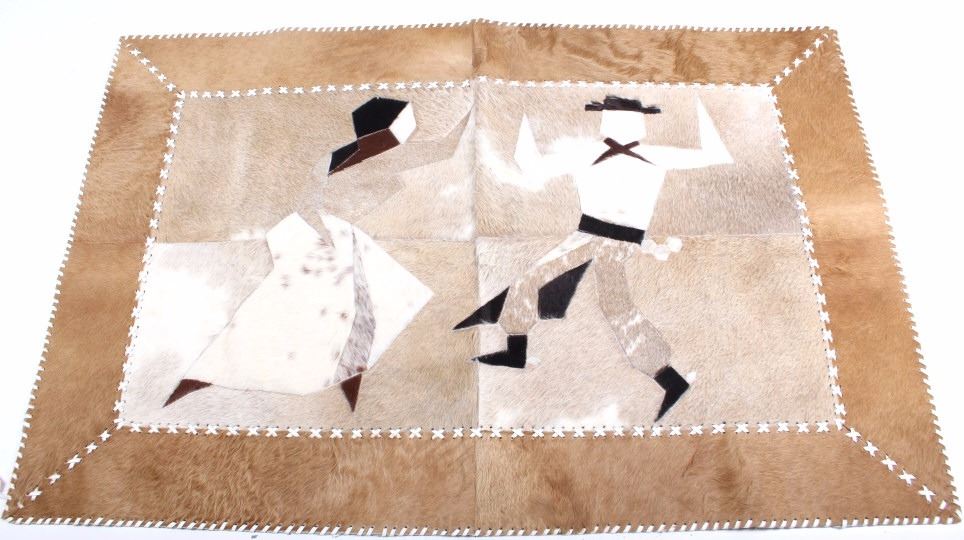 This lot features a cow hide pictorial rug. The rug is leather stitched. The rug depicts a cowboy and cowgirl mid dance. The hide has excellent tones and appears in a general good condition. The piece is in a good overall condition. Measures: 57" W x 37" L
