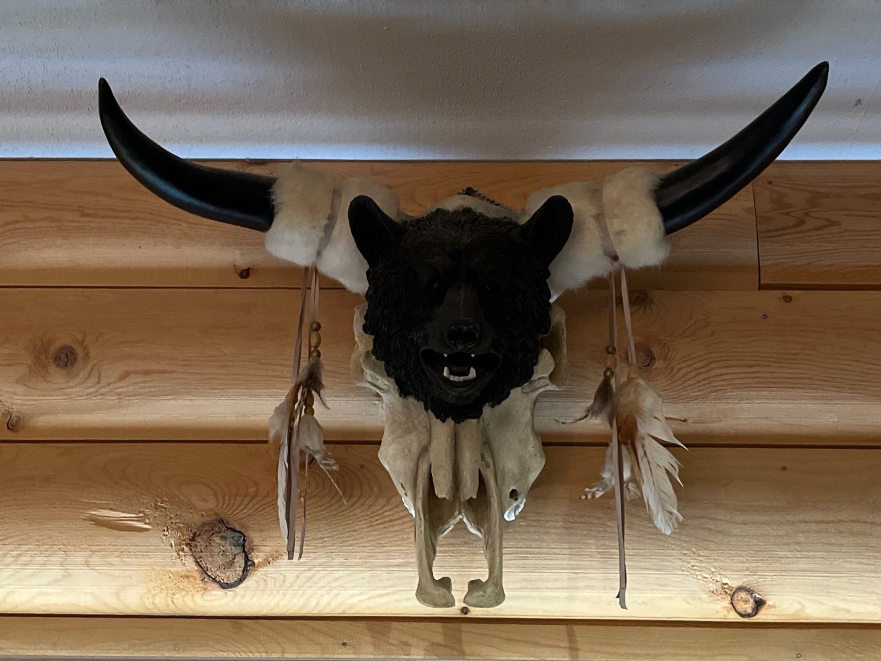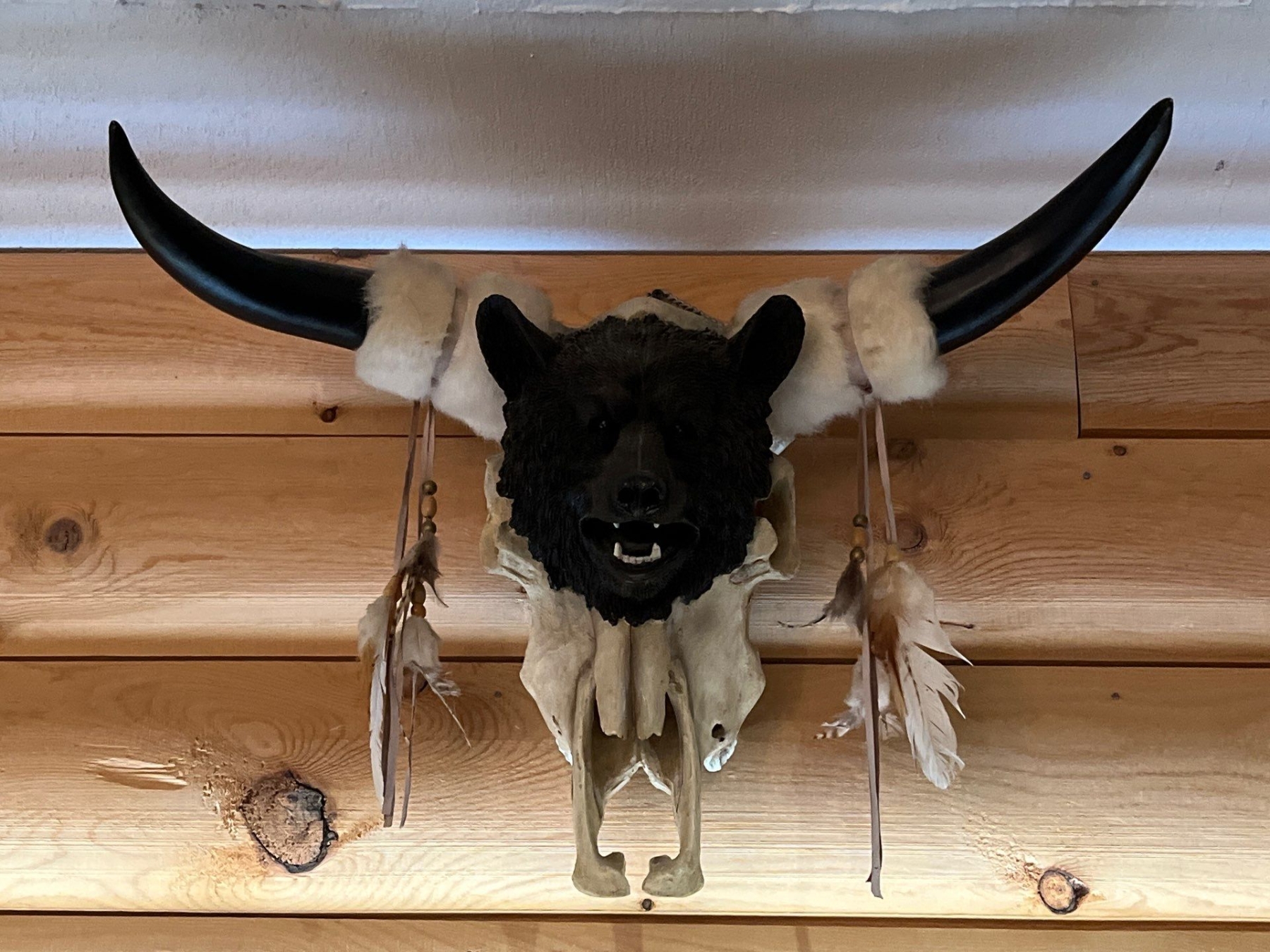 Cow Skull with horns and small bear head with feather tassels