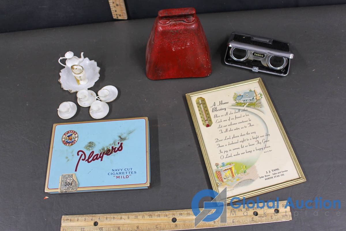 Cowbell, Players Tin, Tasco Handheld Binoculars, Miniature Tea Set