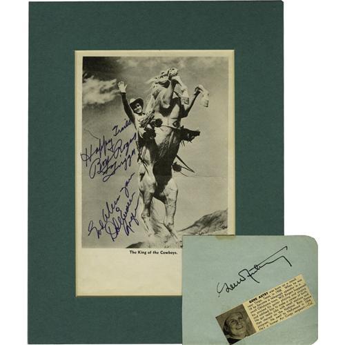<B>Cowboy Autographs.</B></I> Signatures of two of Hollywood's most beloved cowboy stars. Gene Autry has signed an album page, to which the collector had glued a small picture with a few biographical facts. The Roy Rogers and Trigger picture, which appears to have been taken from a book or magazine, is signed "Happy Trails - Roy Rogers- Trigger" while Dale Evans has written on the picture, "God bless you - Dale Evans Rogers." The Rogers picture has two middle creases, one running the width and one the length of the picture, but they do not detract from the overall impressiveness of the tall-in-the-saddle shot. Exciting packet for fans of Saturday matinee action and the late-lamented singing cowboys. <I>With COA from PSA/DNA.</B></I>
