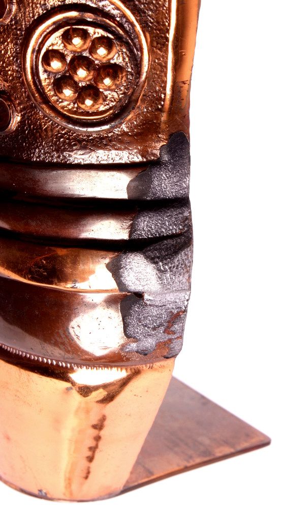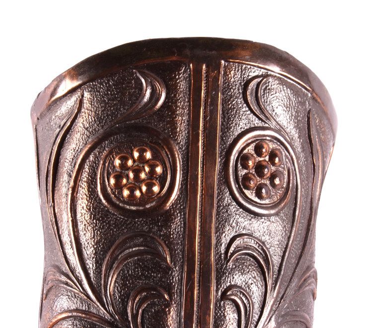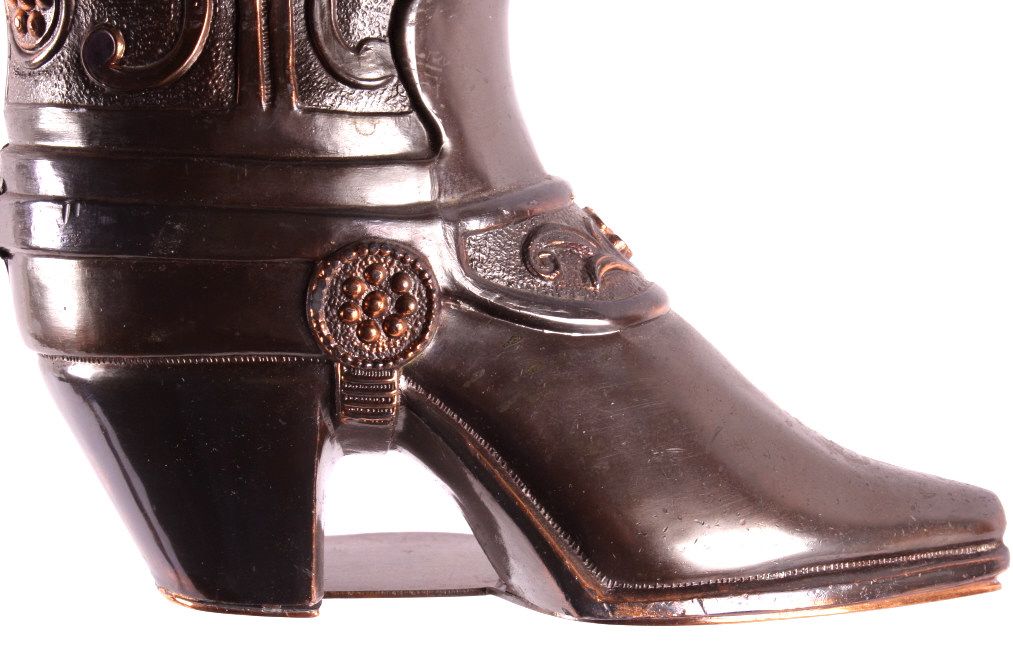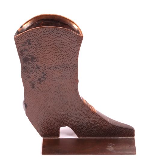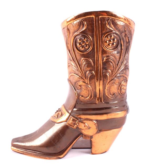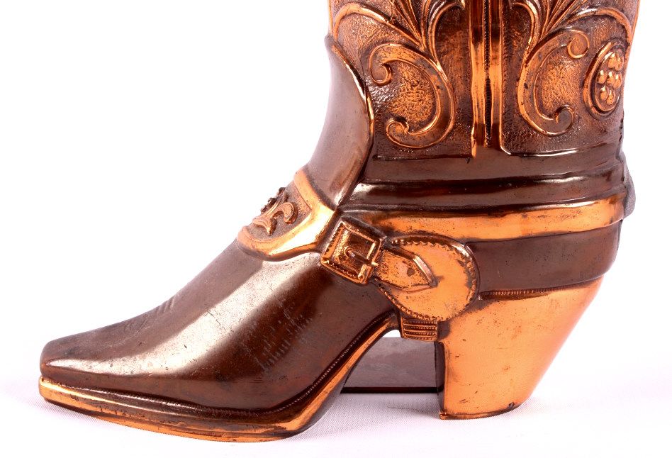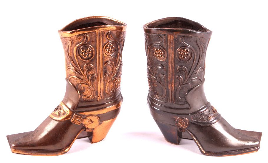 This is a pair of cowboy boot bookends. This matching set is copper plated. Each shows great detail and has a tooled leather look. The bookends are in very good condition. They measure 6.5" x 8"