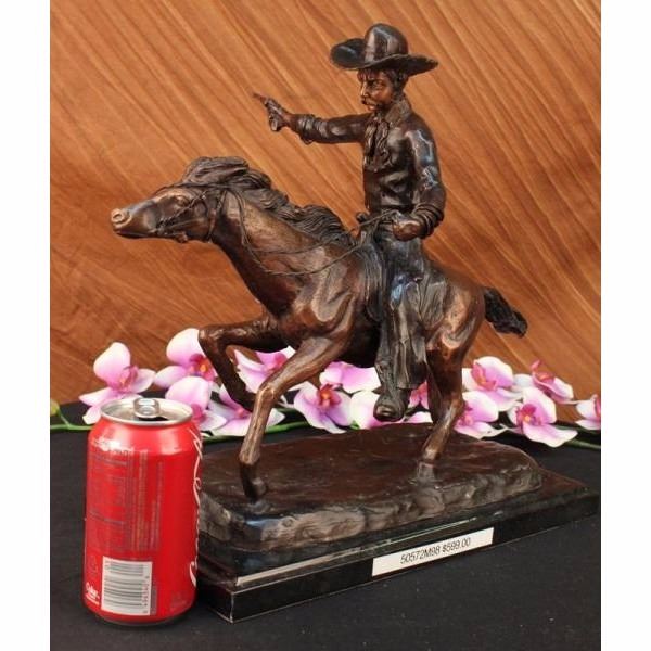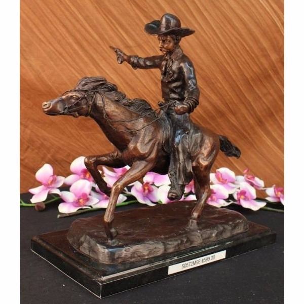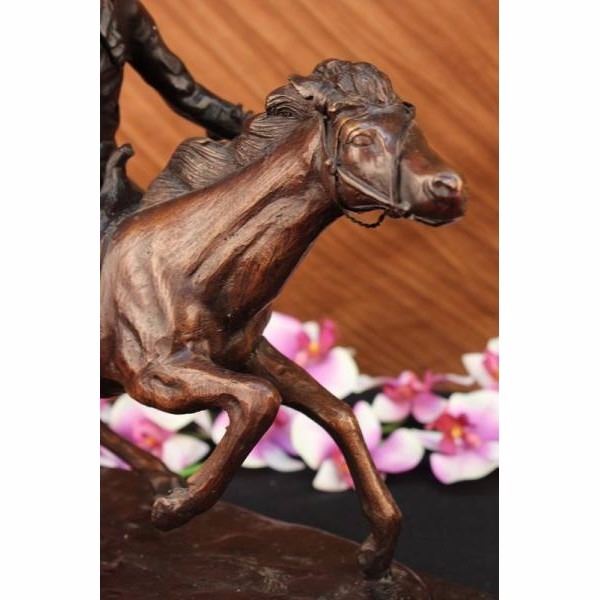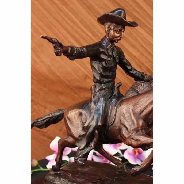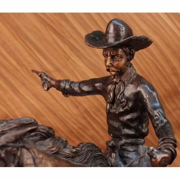 A cowboy charges across the dry land with his gun in the air. His horse gallops, with its nose pointed forward. The cowboy holds the reins tightly in his free hand and he squeezes his thighs on each side of the saddle so he won't get bucked off. He is dressed in a Shirt, Chaps, Boots and the stereotypical cowboy hat. This brown patina sculpture was cast using the lost wax method and mounted on a black marble base. Bronze dimensions with marble base: Height 15 X Width 18 inches. Weight: 23 lbs.Please Note: This is a reproduced bronze sculpture from the original molded and signed. This featured bronze sculpture is a recast after the original, and has been done recently. This 100% bronze sculpture is an abstract piece certain to be a conversation piece.