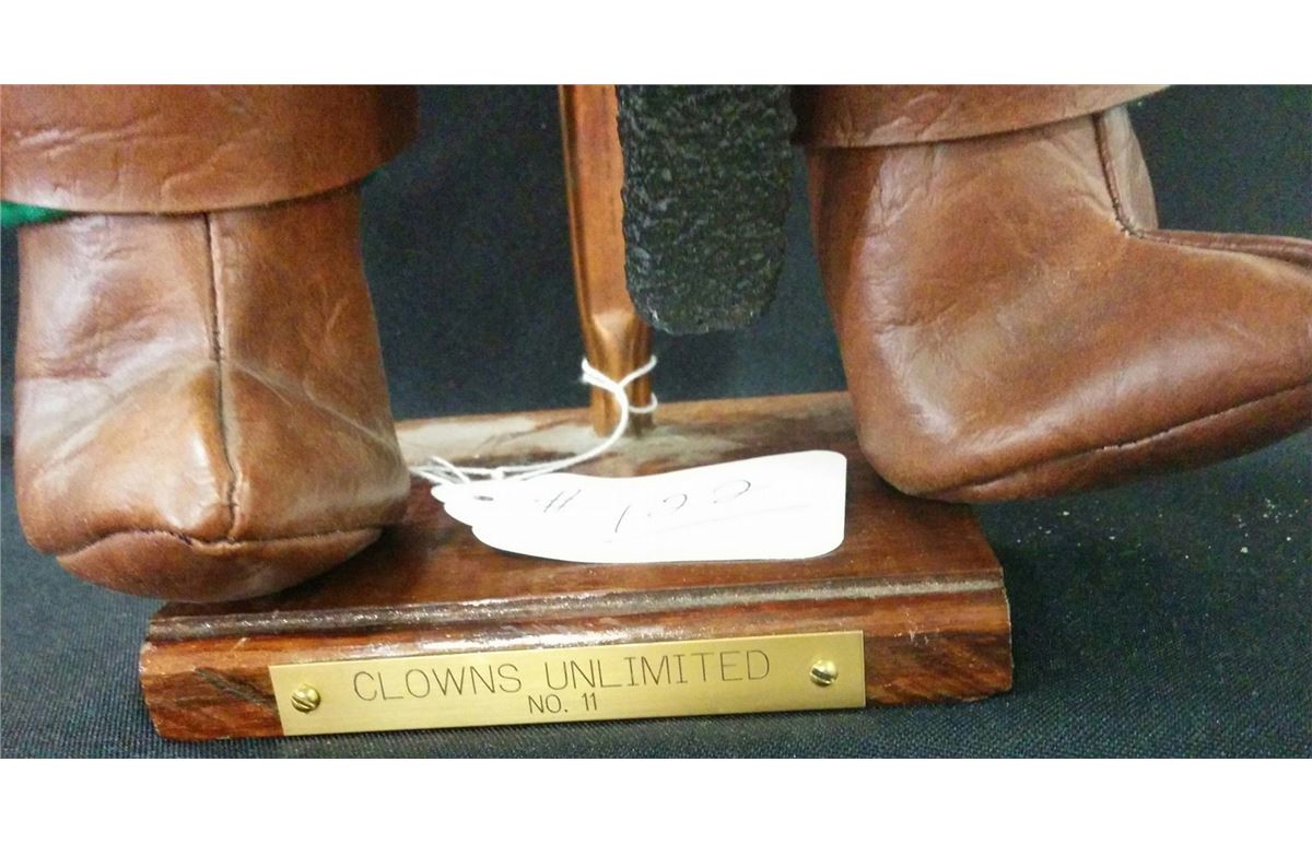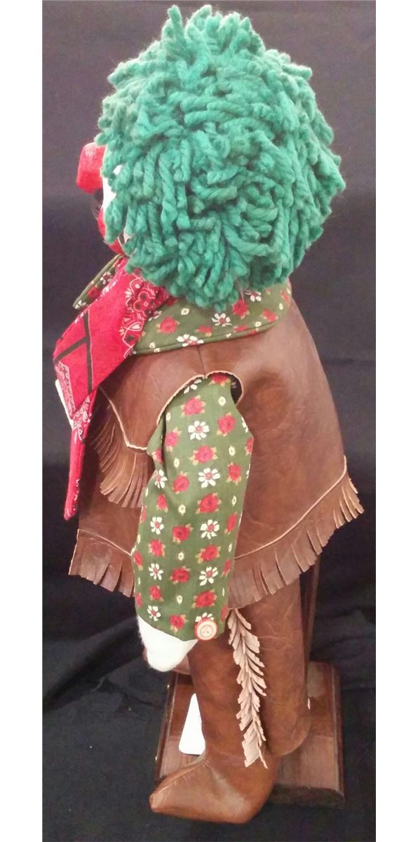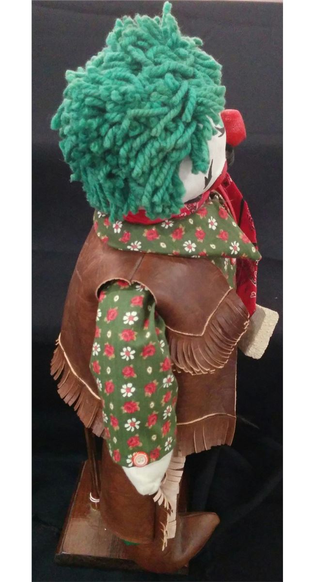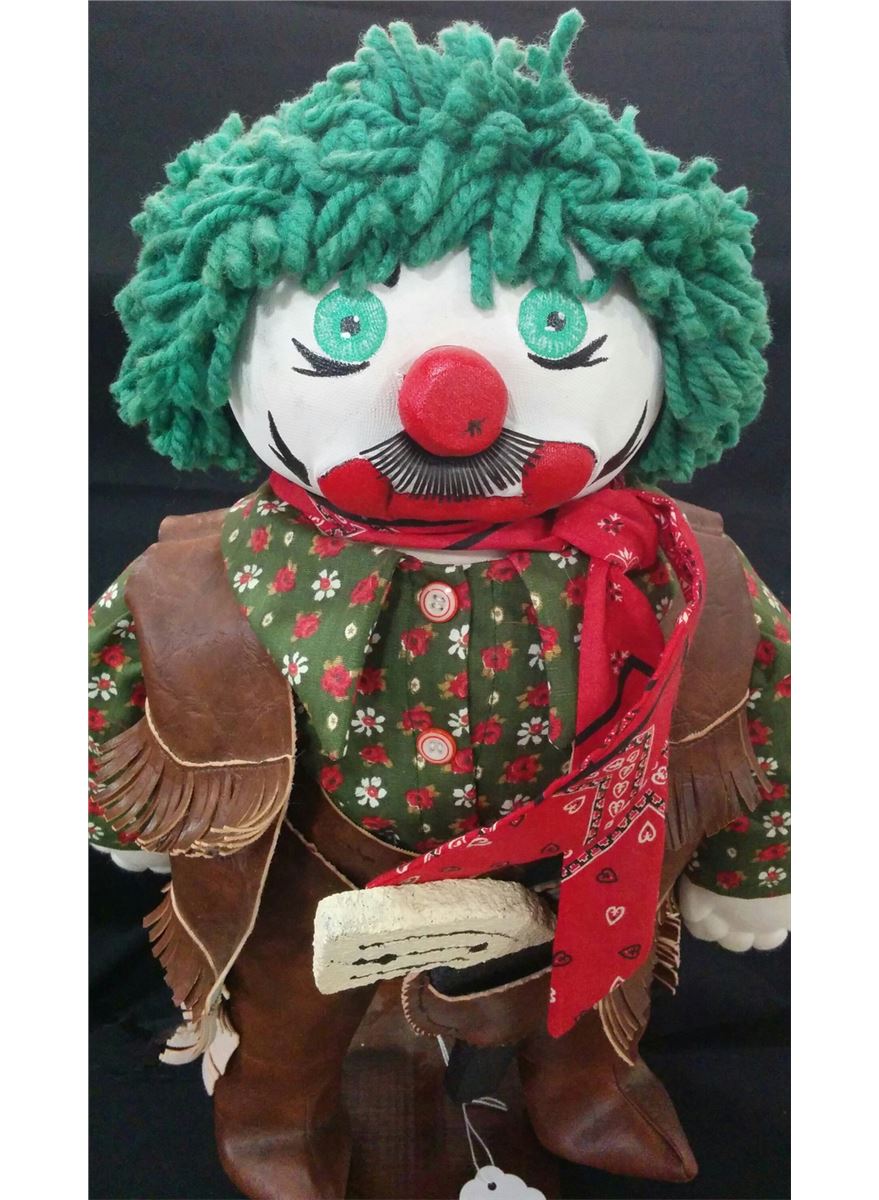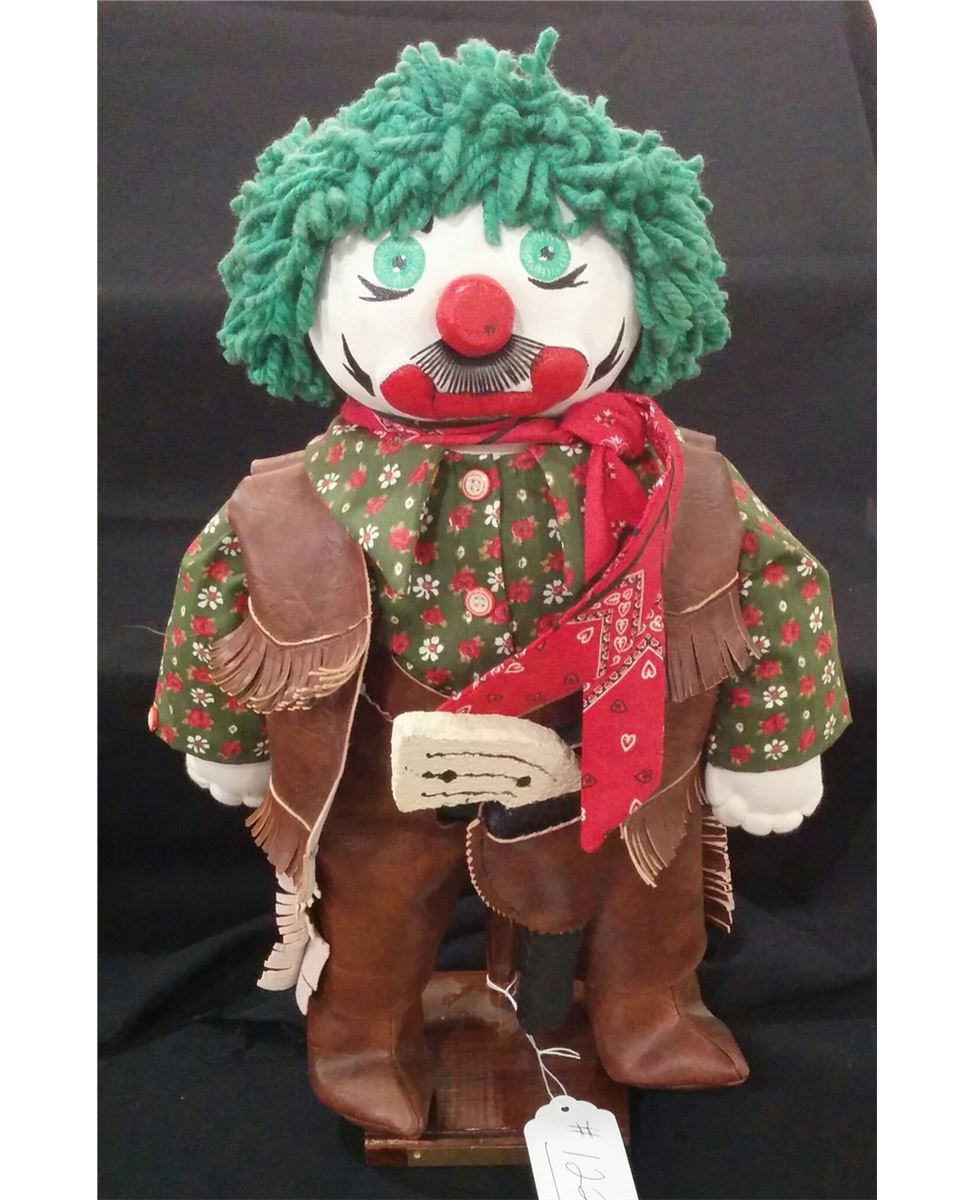 This is a cute cowboy clown sheriff doll. The doll is 18x12x5 including stand. It is made from cloth, synthetic leather and is in good condition. Shipping $22.