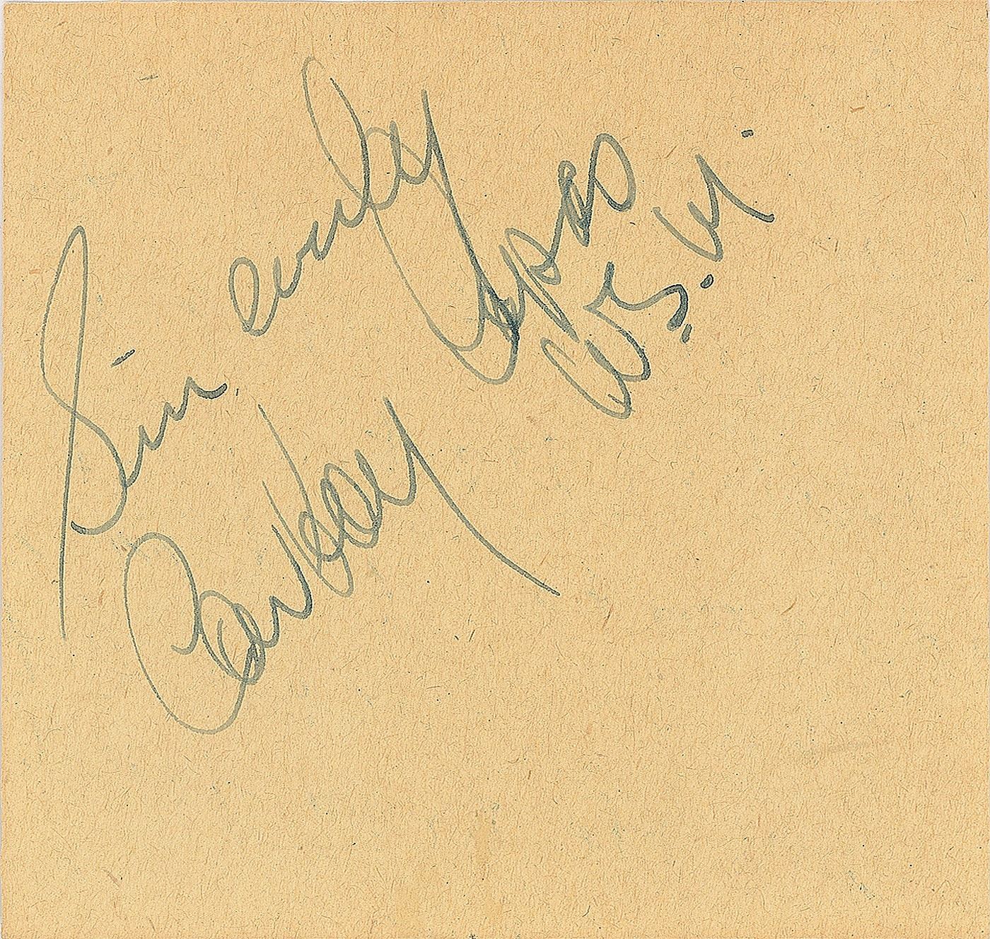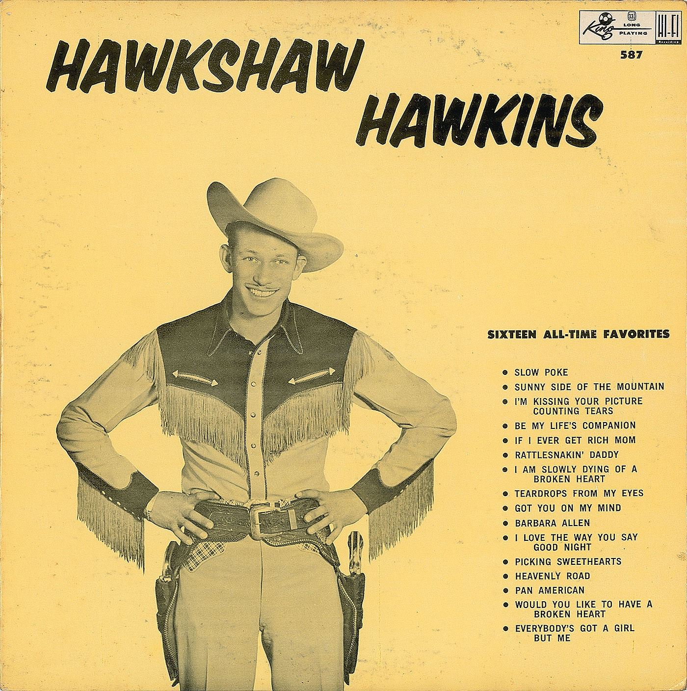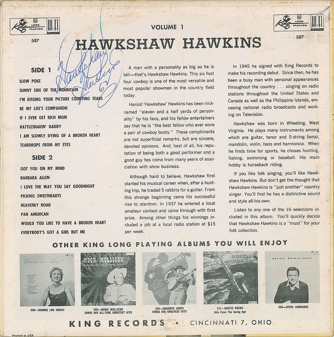 Desirable pairing of items signed by the country stars who also died in the 1963 plane crash that killed Patsy Cline: a Hawkshaw Hawkins album, boldly signed on the back cover in blue ballpoint, "Hawkshaw Hawkins, 62"; and a vintage fountain pen signature, "Sincerely, Cowboy Copas, W.S.M.," on a beige 3.25 x 3 slip. In fine condition, with some scuffing to the album.