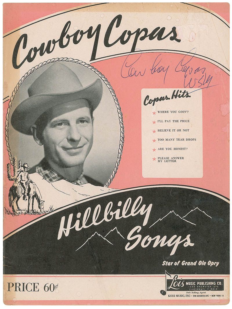 Country singer (1913–1963) who died in the plane crash that also killed Patsy Cline. Original Cowboy Copas ‘Hillbilly Songs’ songbook, 9 x 12, 33 pages, 1947, featuring the sheet music and lyrics to 16 songs, signed on the front cover in blue ballpoint, “Cowboy Copas, WSM.” In very good condition, with a few creases, toning to the left and upper borders, and scattered damp staining and spotting.