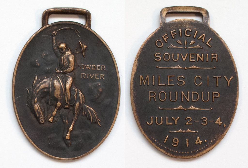An oval brass fob: Official Souvenir Miles City Roundup, July 2-3-4, 1914. Reverse shows cowboy on a bucking bronco.