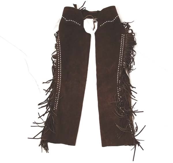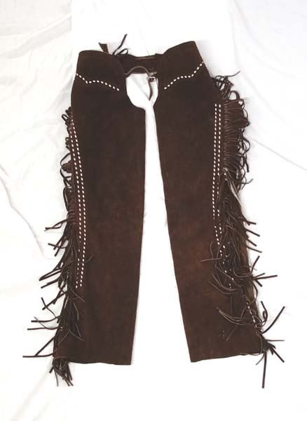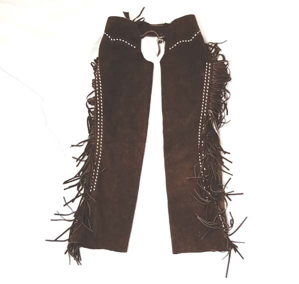 Western Suede Leather Chaps, comes with extra piece of leather measuring 16.75''L x 7''W, zippered sides, waist measures 32'' and can be adjusted up to 38'', 33.75''L, 29.5'' inseam, nice condition