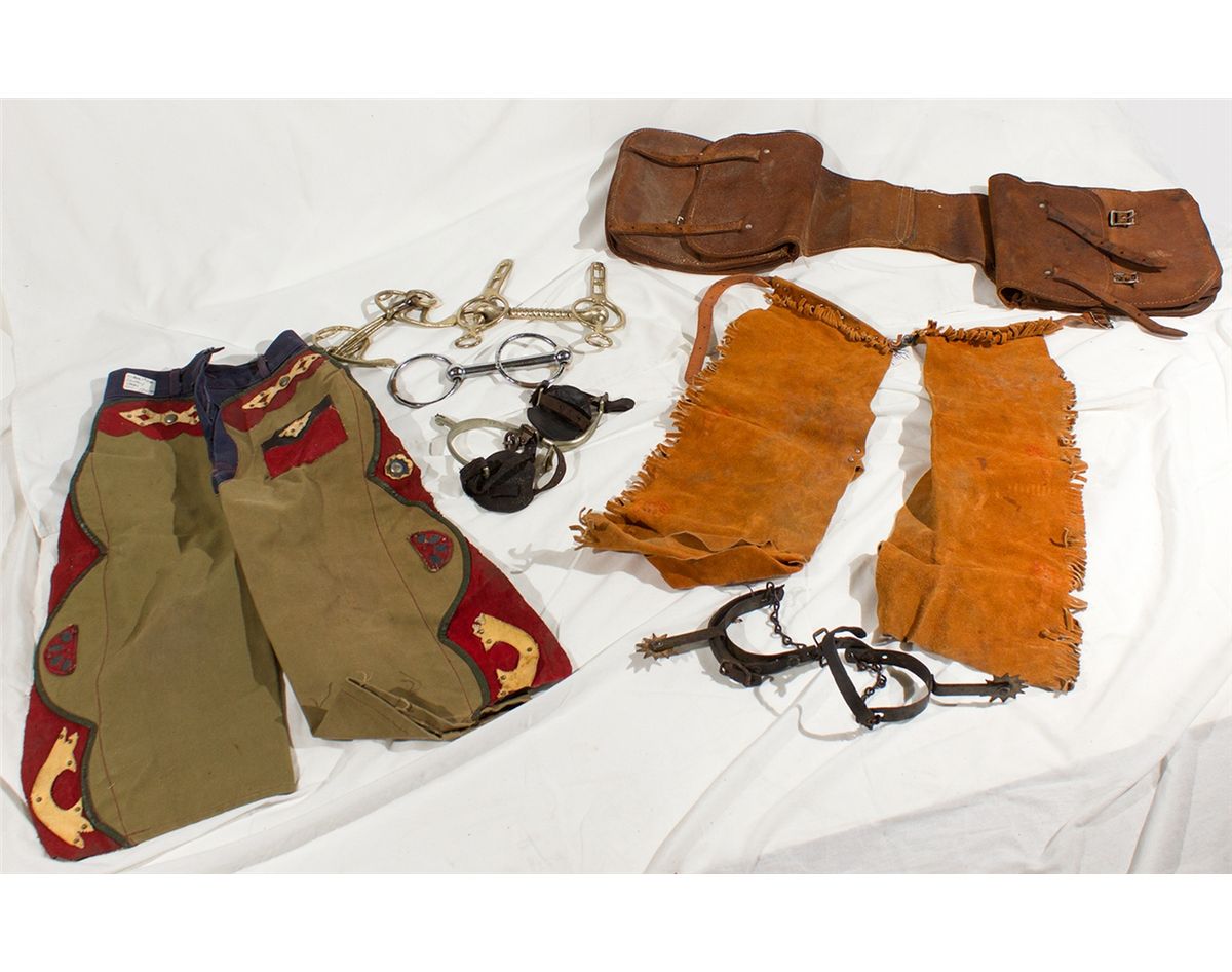 This is a lot of eight items relating to the cowboy culture. Lot includes two pairs of spurs, one iron and one nickel. There are also three horse bits. Two are straight bar, one snaffle and two pairs of kids' chaps. Also included is a set of saddle bags in rough out leather. This is a nice little lot for the buckaroo in your life. - HKA#65636