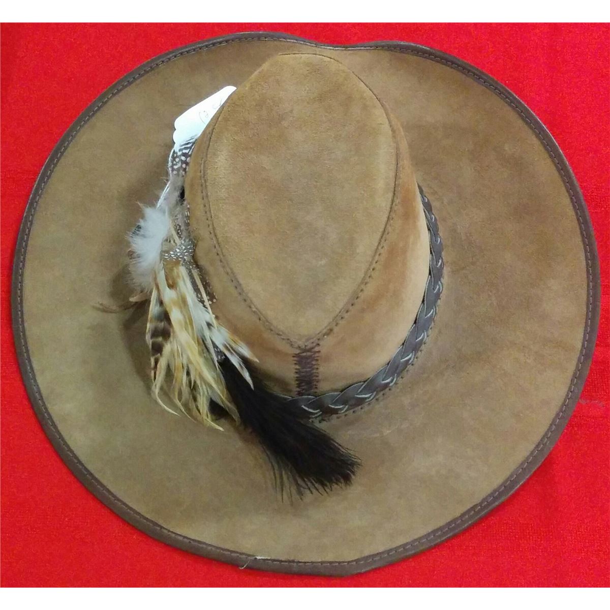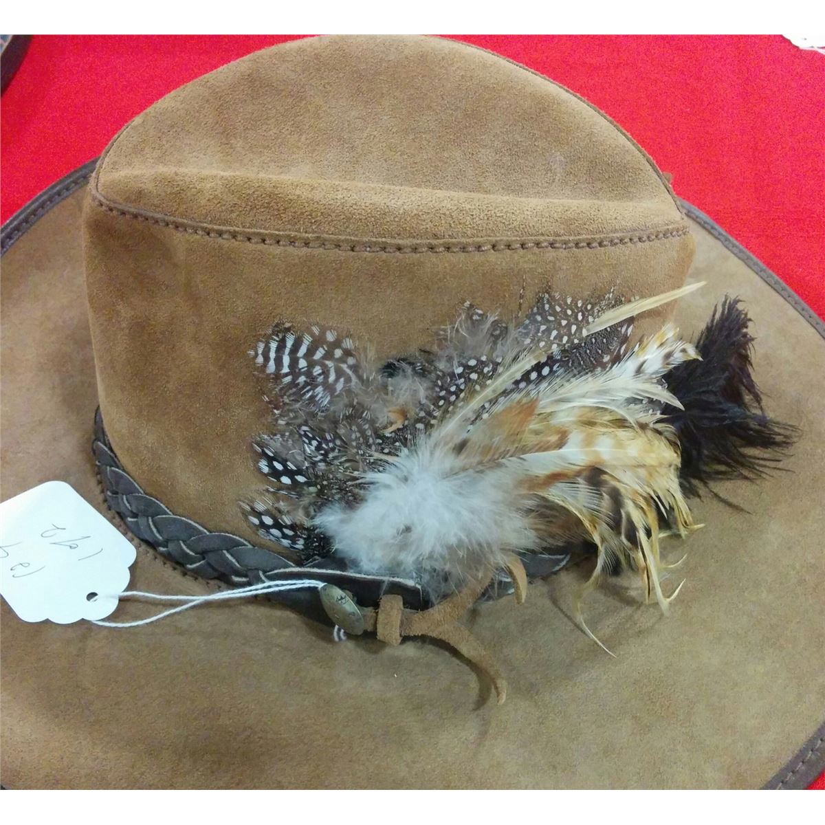 Great leather with feathers cowboy hat size large 7 1/4 inches. The hat is marked San Zeno, California. The bolo tie also has a feather design which matches the hat. Condition: Nice hat and bolo - very little wear. Shipping $20.00.