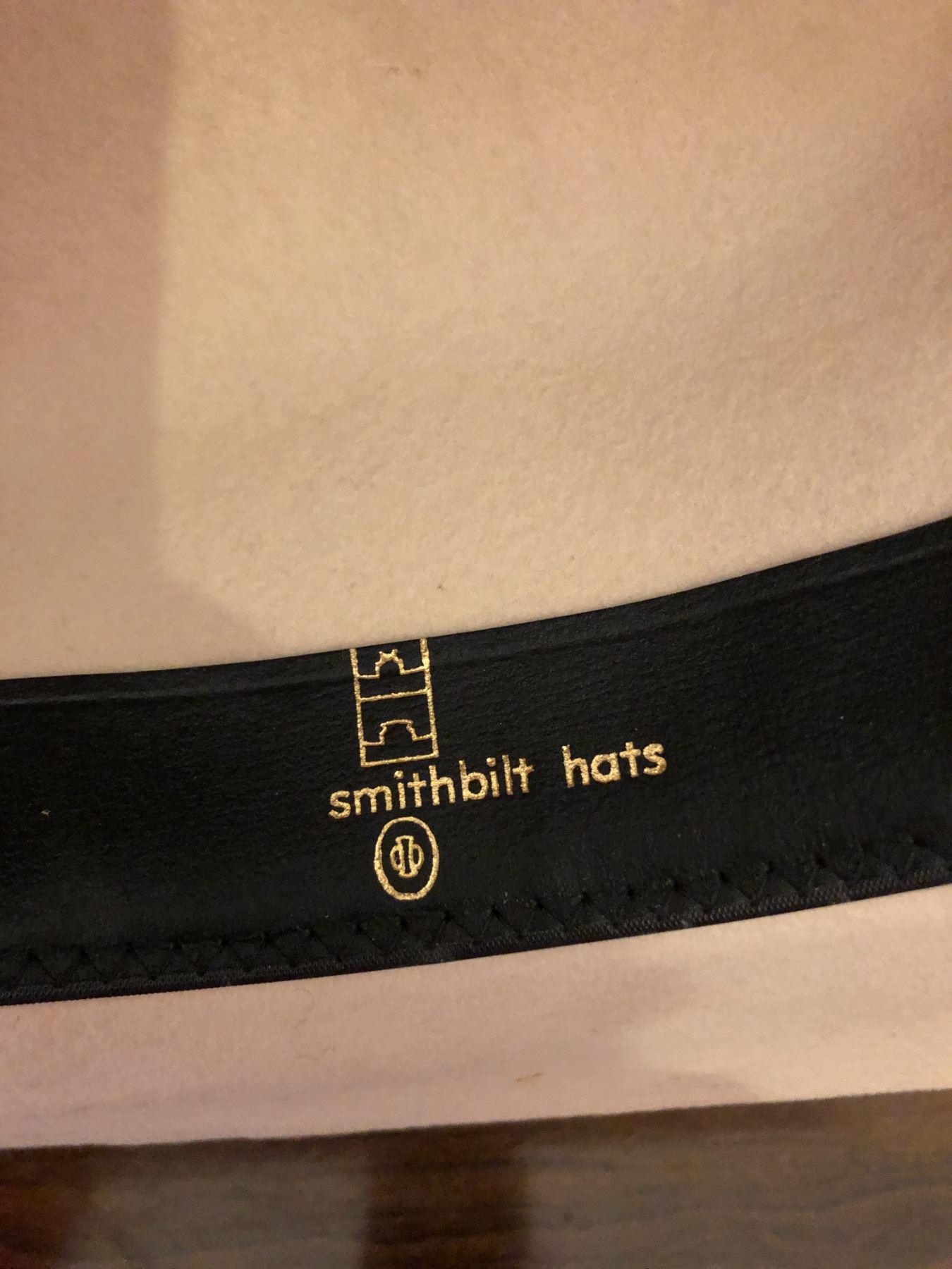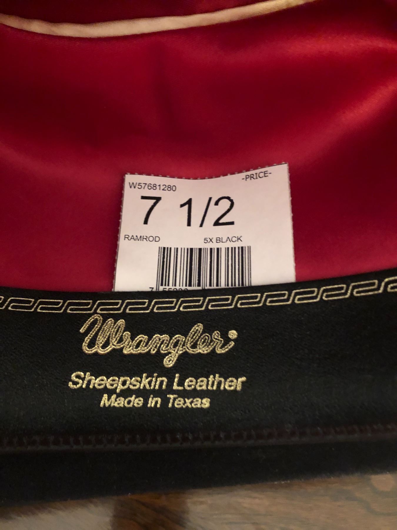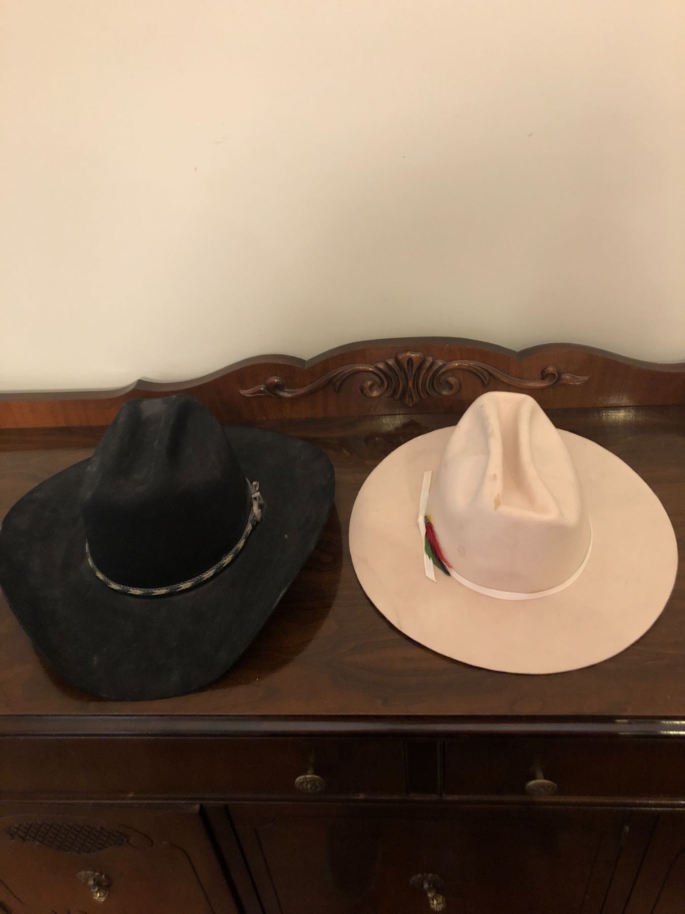 2 Cowboy Hats. Black Wrangler Sheepskin Leather size 7 1/2. White Smithbilt Hats size 7 3/4