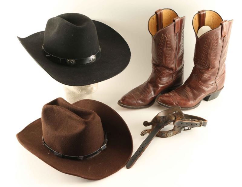 Pair of spurs with overlaid design, Pair of Tony Lama Boots size 9 D brown leather, Black Stetson Stallion XXX Wool 7 1/4 size with hatband, Brown Rock mount felt hat 7 1/8 size with sterling concho hatband.