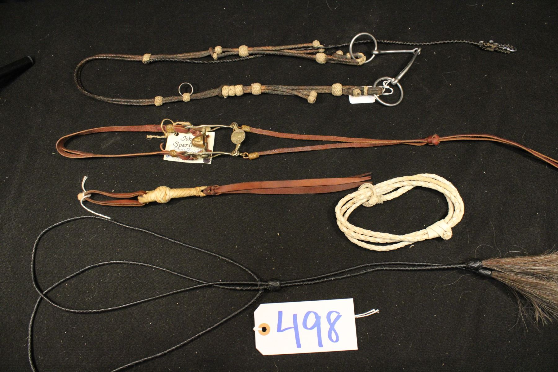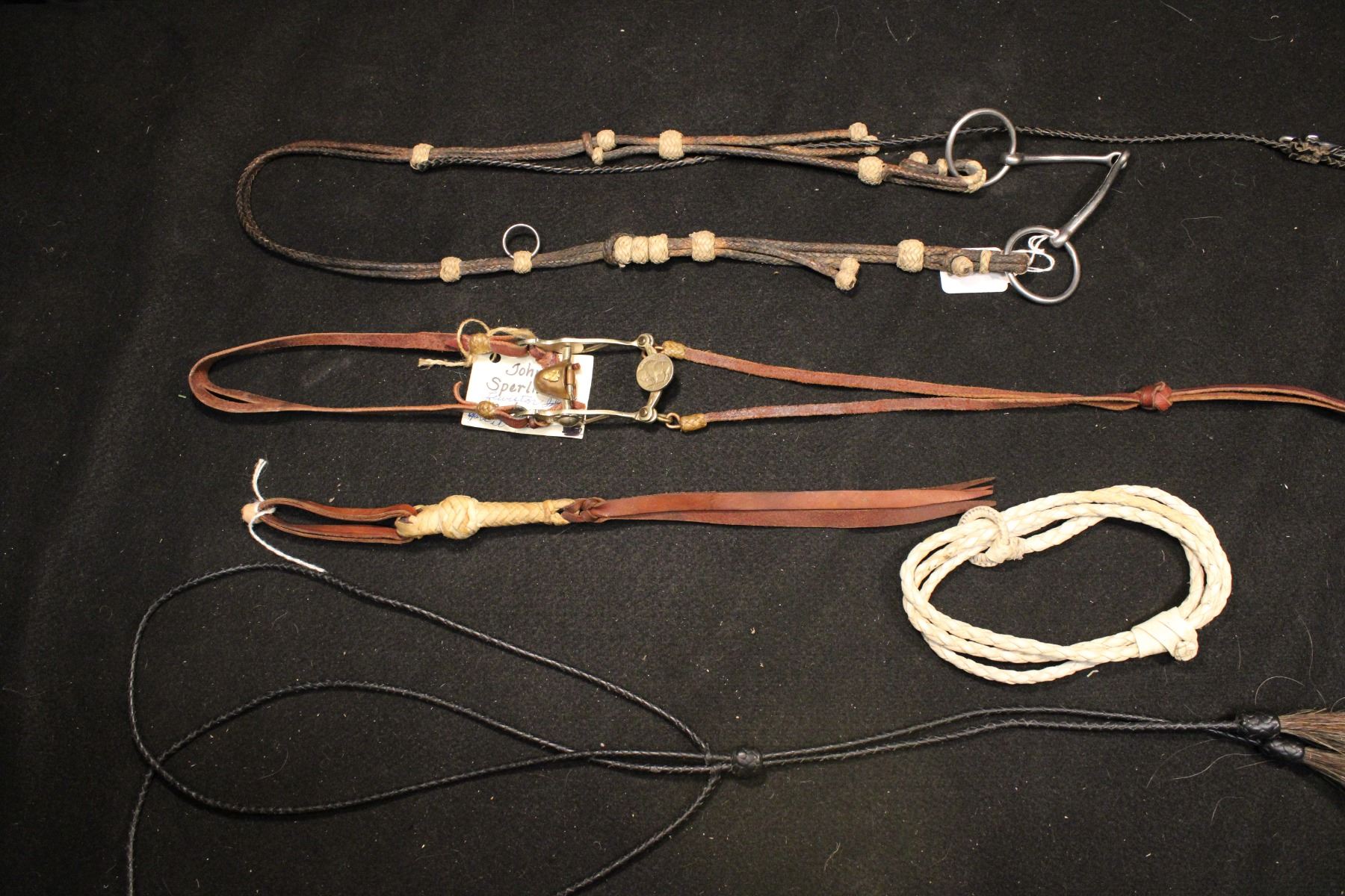 John Sperline bit/ bridle braided stampede string. Rawhide and beaded quirts. Braided headstall/ snaffle and riata.