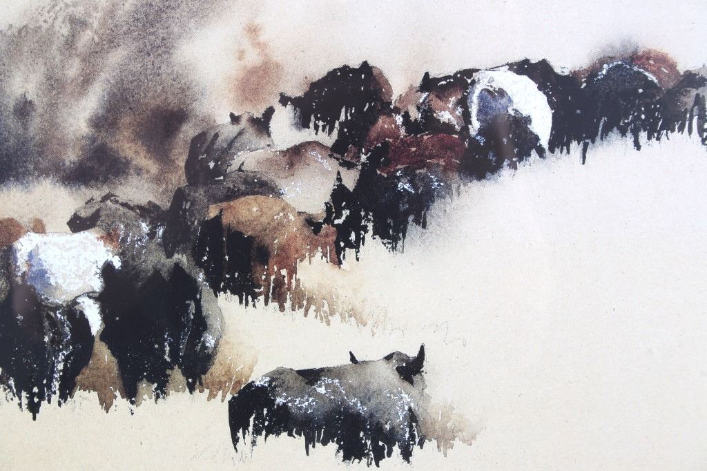 Featured in this lot is this framed lithograph of a cowboy moving cows by artist Williamson. The lithograph features a wonderfully and professionally crafted lithograph construction that is framed with a painted white frame and features a scene of a cowboy moving cows in a line and off into the distance. The artist signature is seen in the top right corner of the lithograph and is hand signed "Williamson." The condition of this framed lithograph is good with some wear to the paint adorning the frame but otherwise shows good overall condition. The measurements framed artwork is 22 1/4" x 39 5/8" and the visible art measures 13 1/2" x 30 3/4".