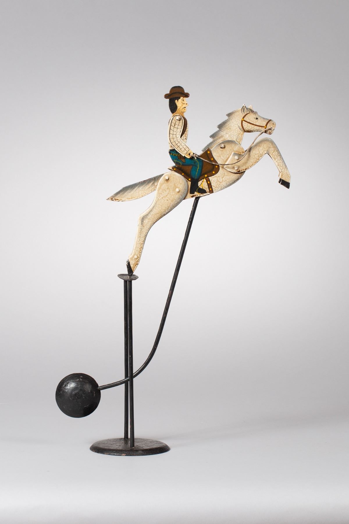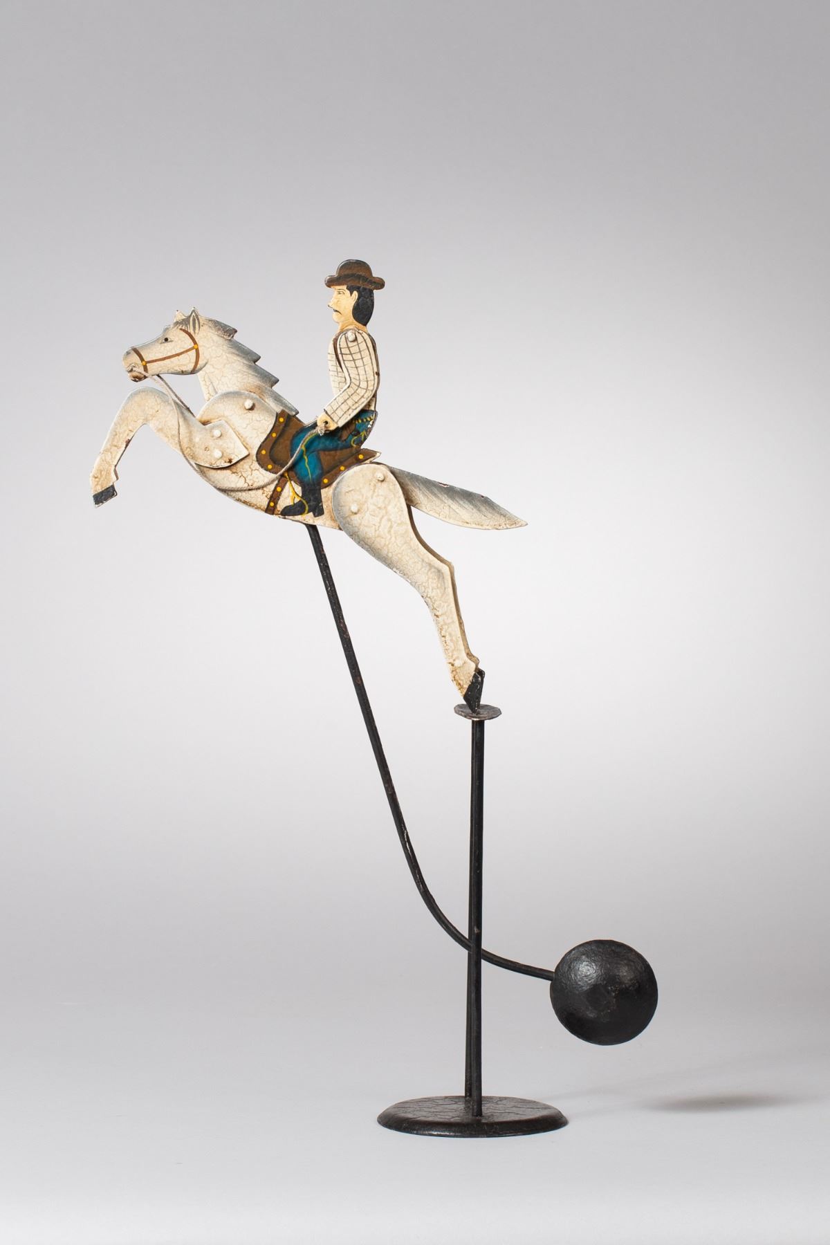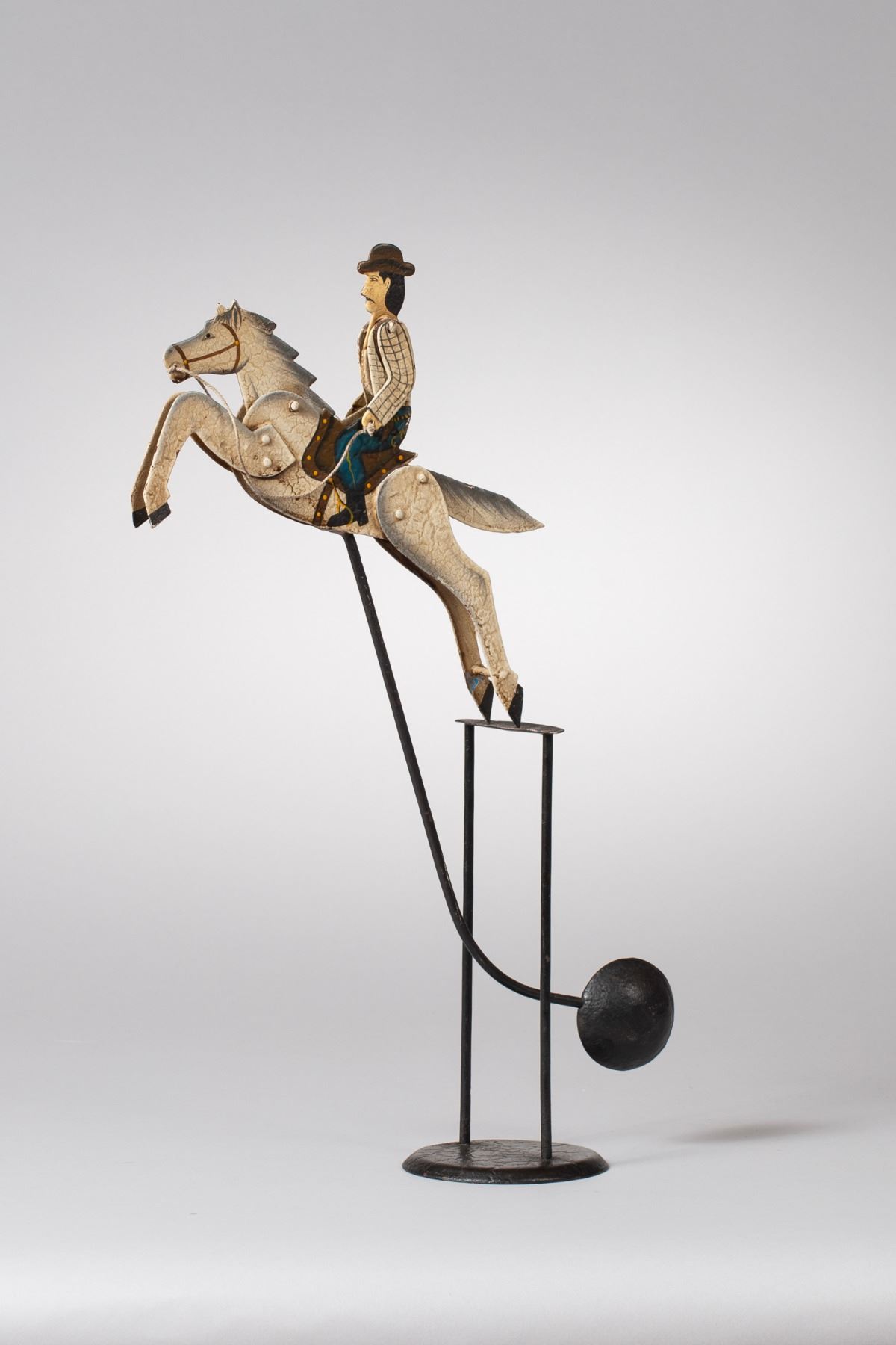 Cowboy Folk Art. Features a cowboy on a horse galloping on a blancing kinetic pendulum system.