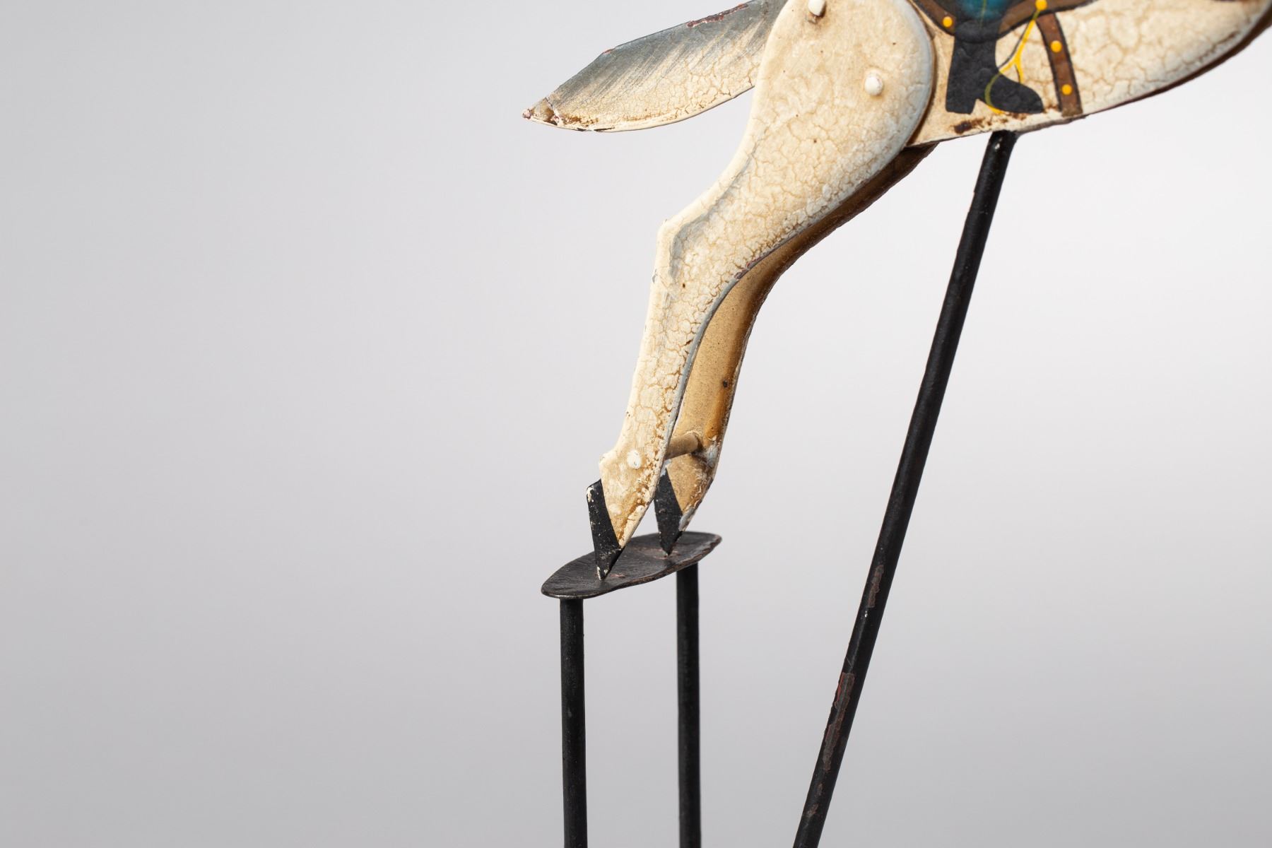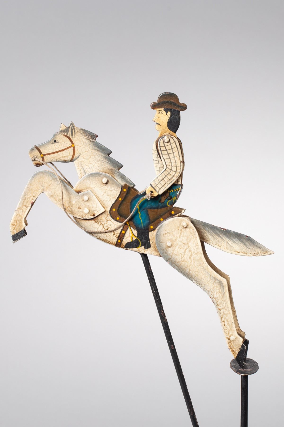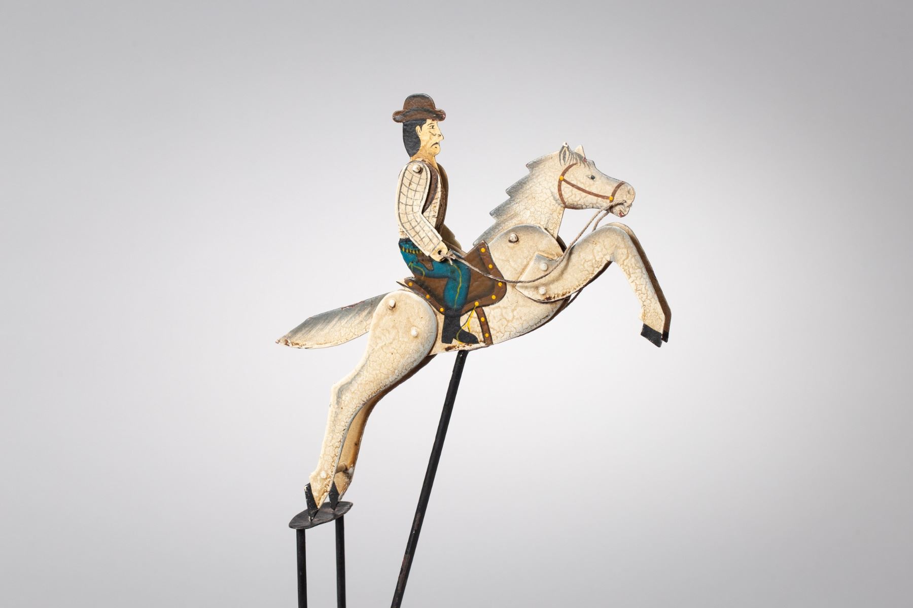 Cowboy Folk Art. Features a cowboy on a horse galloping on a blancing kinetic pendulum system.