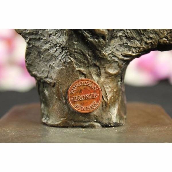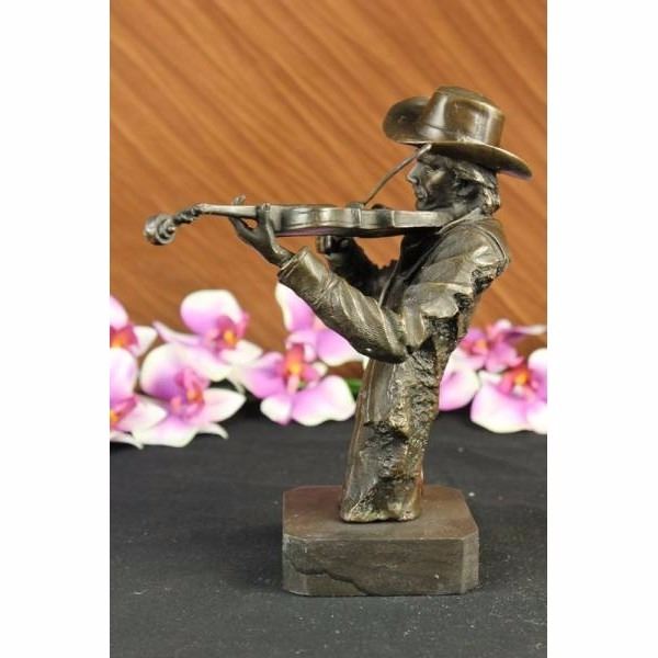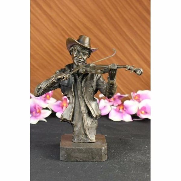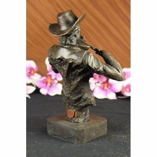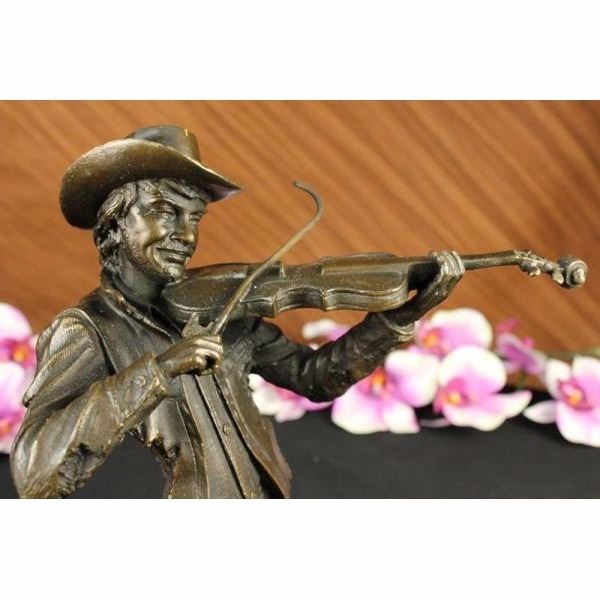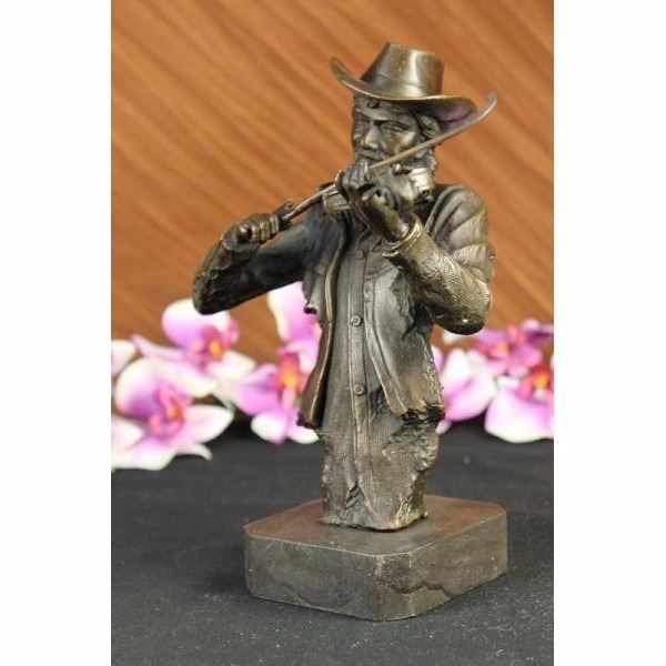 This spectacular piece of art is one of a kind. He plays he violin while he gracefully smiles. He has this distinguish finish to him in where he is cut right at the torso and its not completely finish in the back. He wears a button down and a cowboy hat. This sculpture was cast using the ancient "Lost Wax Method" stained in brown patina finish for preservation. He is 100% handmade and 100% bronze, mounted atop a brown base. Condition : This sculpture is in a perfect condition. Bronze Dimensions with Marble Base:Height 10" x Width 8 1/2" Marble Dimensions: 3' X 3" Height without base: 9" Weight : 7 LBS Inventory : 49Y7623294
