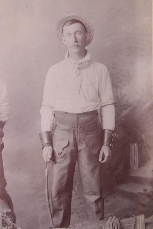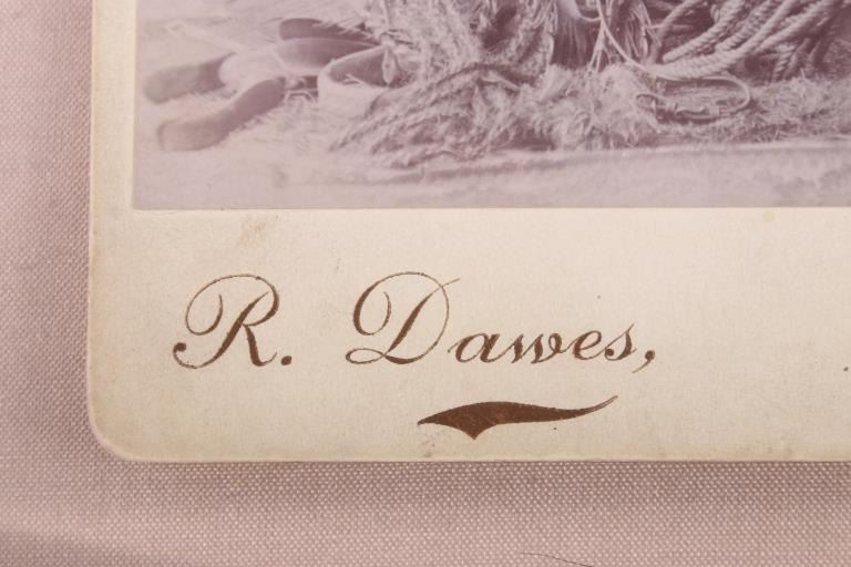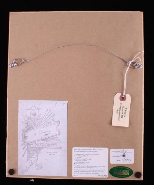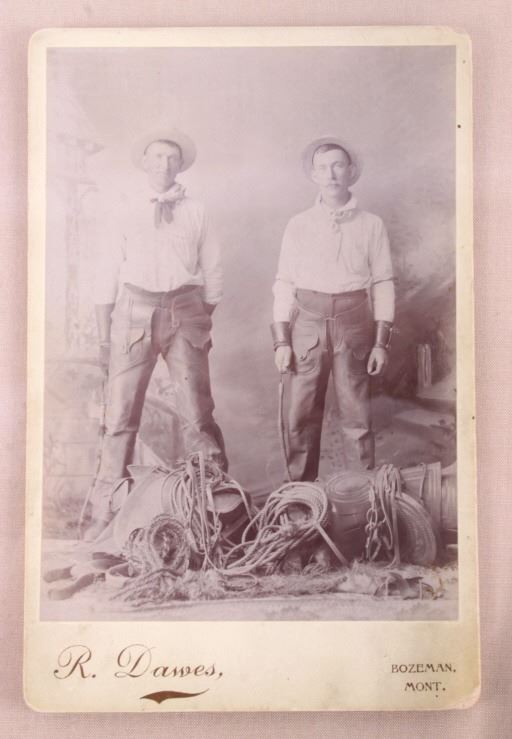 The lot features an original photograph cabinet card from R. Dawes of Bozeman, Montana in the 19th Century. This cabinet boudoir card shows an original photograph of two Montana cowboys both wearing full western getup with leather chaps, cowboy hats, scarves, and leather cuffs both holding bull whip riding quirts. At the two cowboy ranchers feet are excellent early 1800’s leather tooled saddles with headstalls, horsehair lariats, saddle bags and other gear. The piece is marked on the back by the R. Dawes Artistic Photography company of Bozeman, Montana. This piece has been professionally framed with Premium Clear Tru Vue glass on an acid free backing. The photograph so clearly represents the Bozeman, Montana Territory Vigilante Days of the Old West with two hard stone faced cowboys showing of their saddlery pieces. The cabinet card was appraised by Sundog for over $1,000 and still holds their original tag. Provenance: From the renowned Sundog Fine Art Bozeman, Montana collection and collected by Bruce VanLandingham. Bruce VanLandingham was a pillar in the American Indian collecting community and a respected expert. Along with being an avid collector Bruce also was the sole owner of Sundog Fine Art in Bozeman which was both part museum and gallery. Cabinet card measures 5.25”x6.5”. Frame is 14.5”x11.75”.