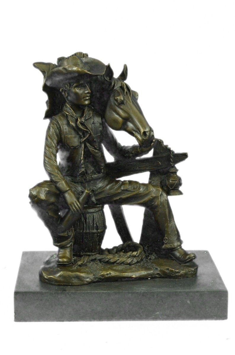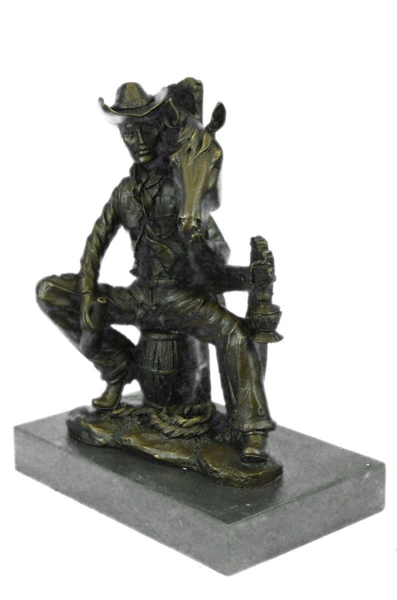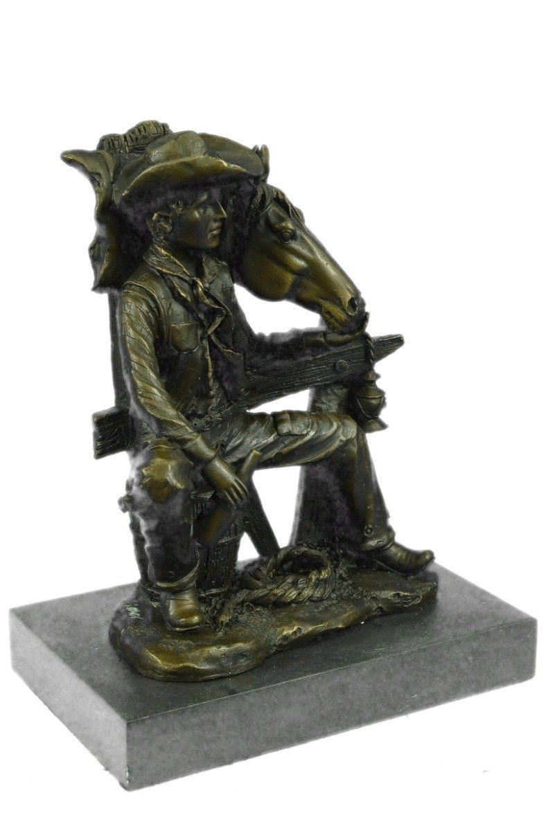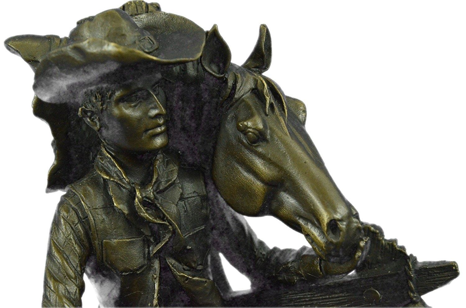 The Trusted Companions in this sculpture, a cowboy and his horse, are eager and ready to ride the trail together. this bronze figures are standing on rocky soil with a lucky Horseshoe . Cowboy has chaps and vest and his cowboy boot. His horse's breast collar is adorned with brown embellishments. 100% bronze and handmade this brown patina sculpture was cast using the Lost Wax Method and sits on a black marble. Bronze Dimensions with Marble Base: Height 10 X Width 8 inches. Weight: 10 LBS. Inventory: 16Y11634761