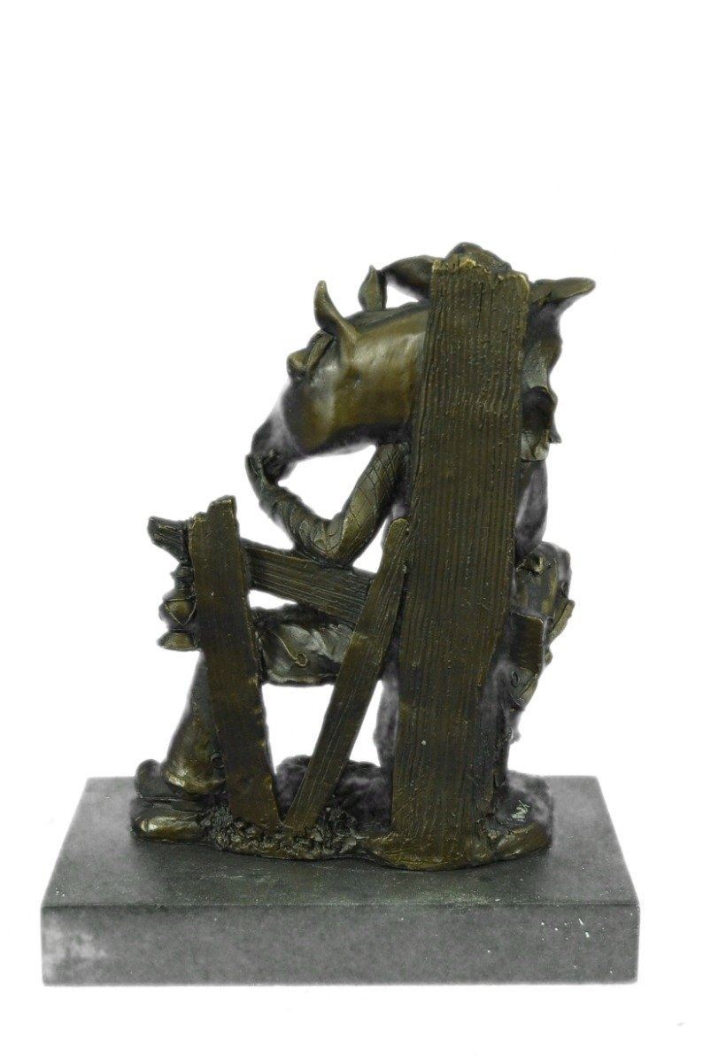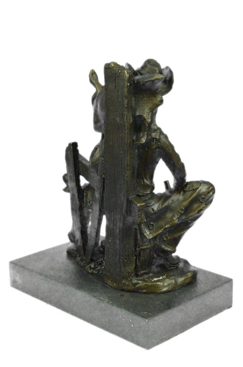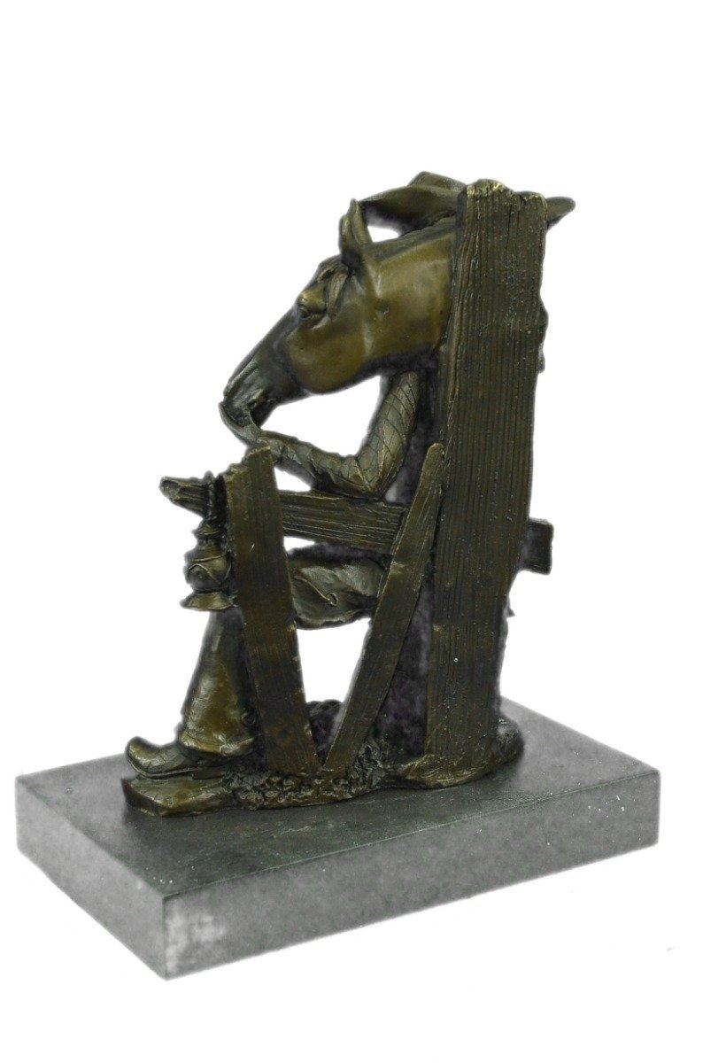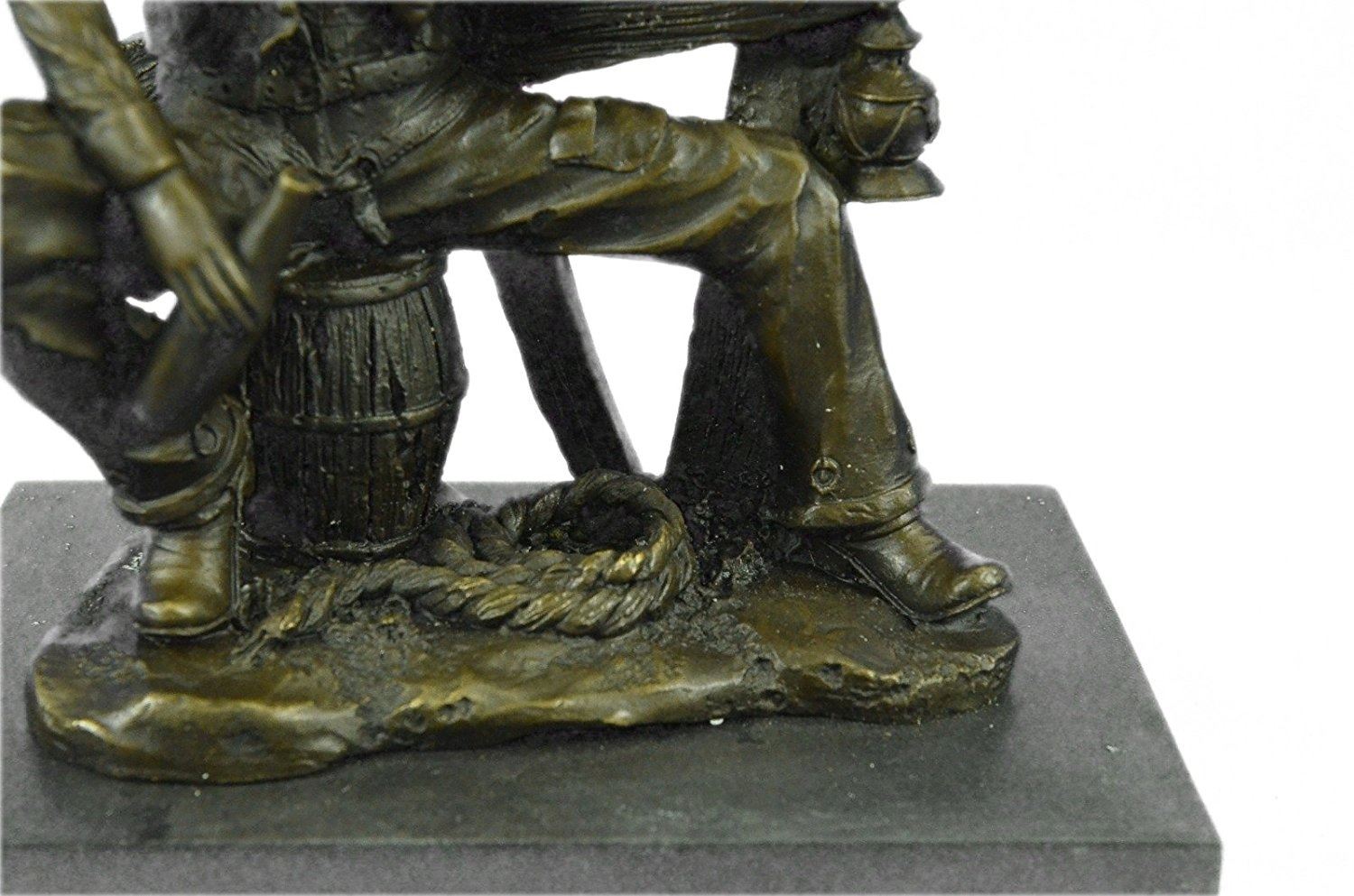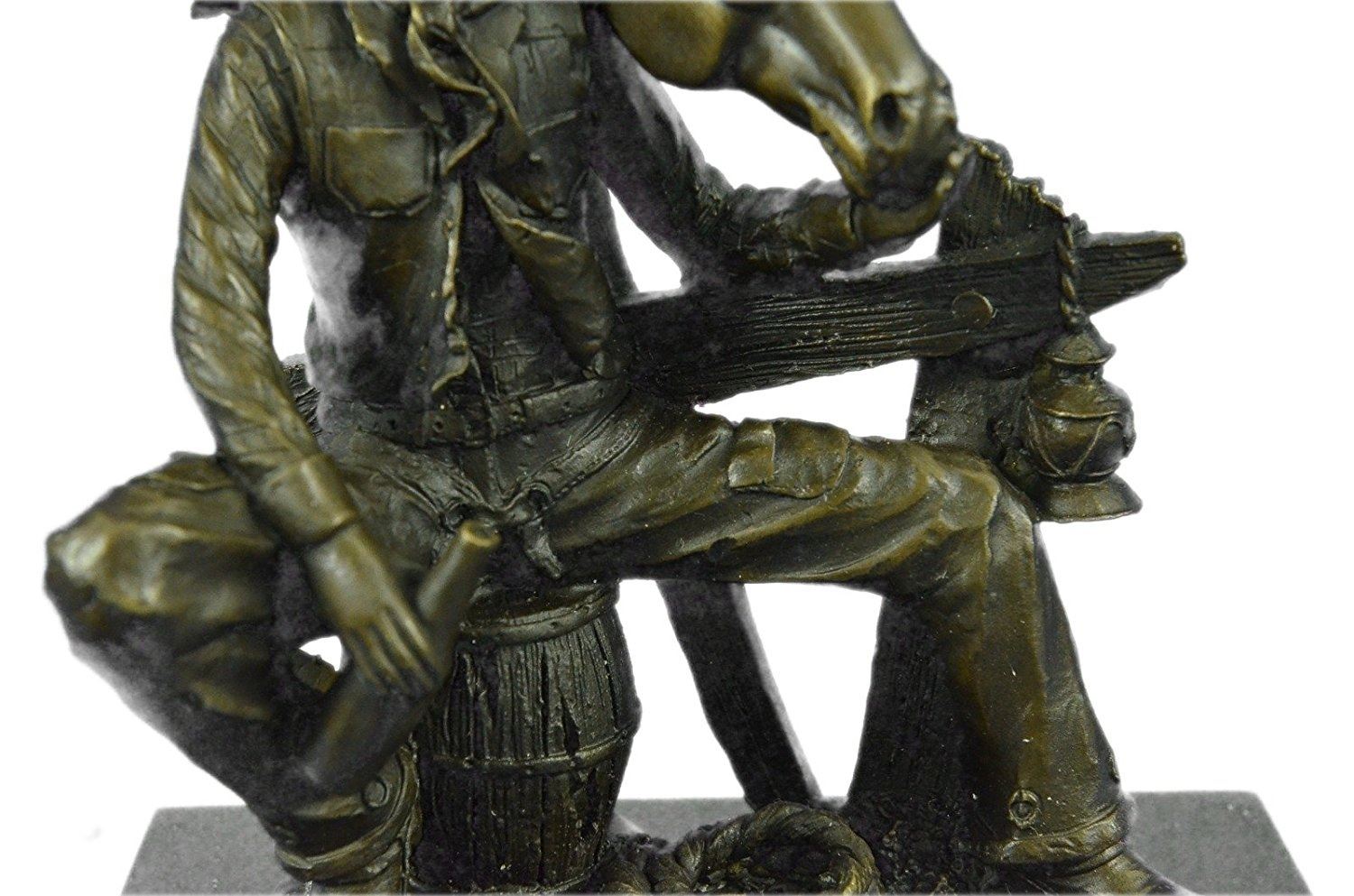 The Trusted Companions in this sculpture, a cowboy and his horse, are eager and ready to ride the trail together. this bronze figures are standing on rocky soil with a lucky Horseshoe . Cowboy has chaps and vest and his cowboy boot. His horse's breast collar is adorned with brown embellishments. 100% bronze and handmade this brown patina sculpture was cast using the Lost Wax Method and sits on a black marble. Bronze Dimensions with Marble Base: Height 10 X Width 8 inches. Weight: 10 LBS. Inventory: 16Y11634761
