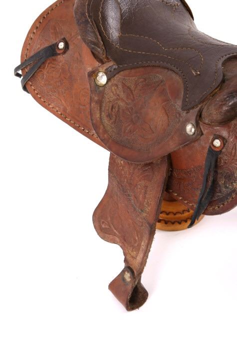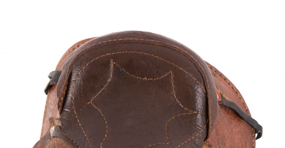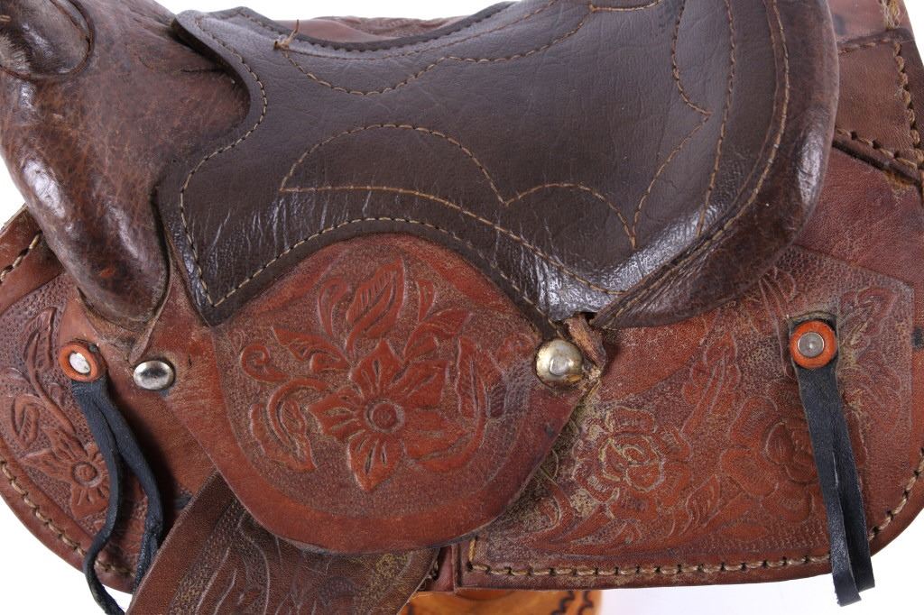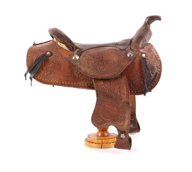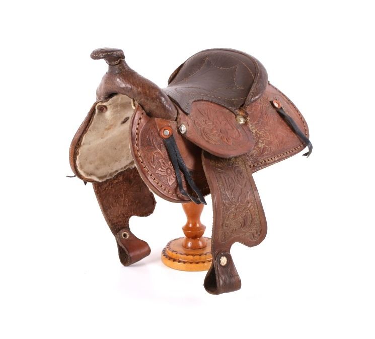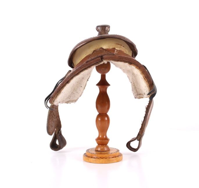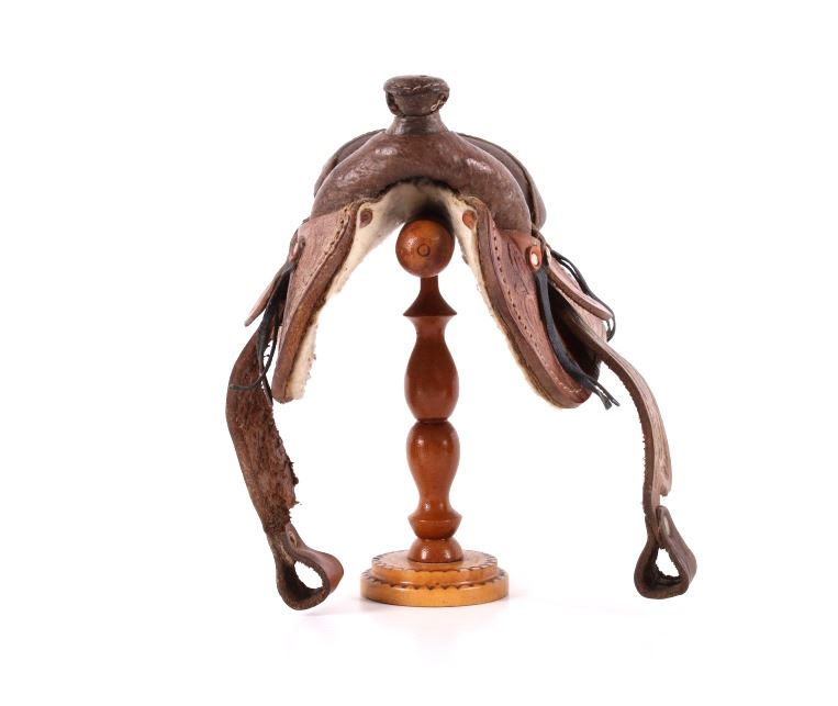 For your bidding pleasure is this Cowboy Wade A-Fork Salesman Sample Saddle. The original saddlery shop salesman sample most likely dates to the early 1900's and is a rare find. A Wade tree saddle is a slick fork buckaroo style that is specifically built to be a working saddle. It's designed for handling livestock and for maximum comfort during long, strenuous hours in the saddle. Slick fork saddles otherwise known as A-fork saddles leave the front of the saddle open and provides comfort for long rides and freedom of movement for ranch work. This sample saddle would have been used to show off the countless options a saddle maker can contribute to the right custom saddle. showing the type of harness the stirrups and latigo keepers are attached to; this particular saddle sample also shows placement of saddlebags just above the skirt of the saddle even with where the layer of leather called the seat jockey would be. This saddle comes displayed on a small saddle stand. The measurements of this sample saddle are 8 1/2" long x 5" wide x 5 1/2" tall.