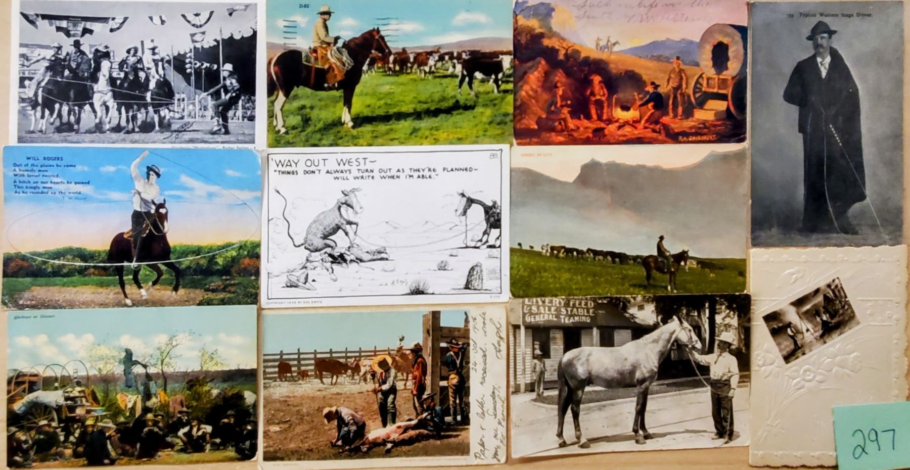 Approx. 100 cowboy postcards. Detroit, Dramatic True Stories, etc. Early to linen.