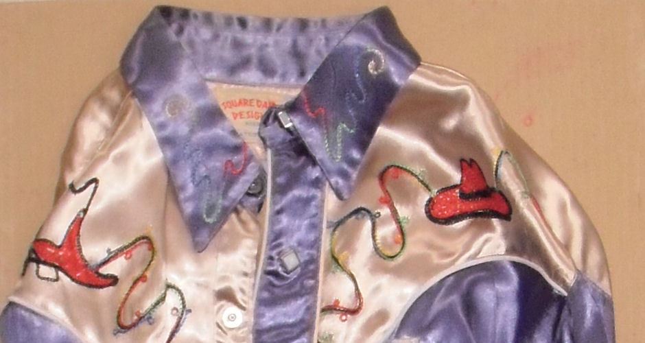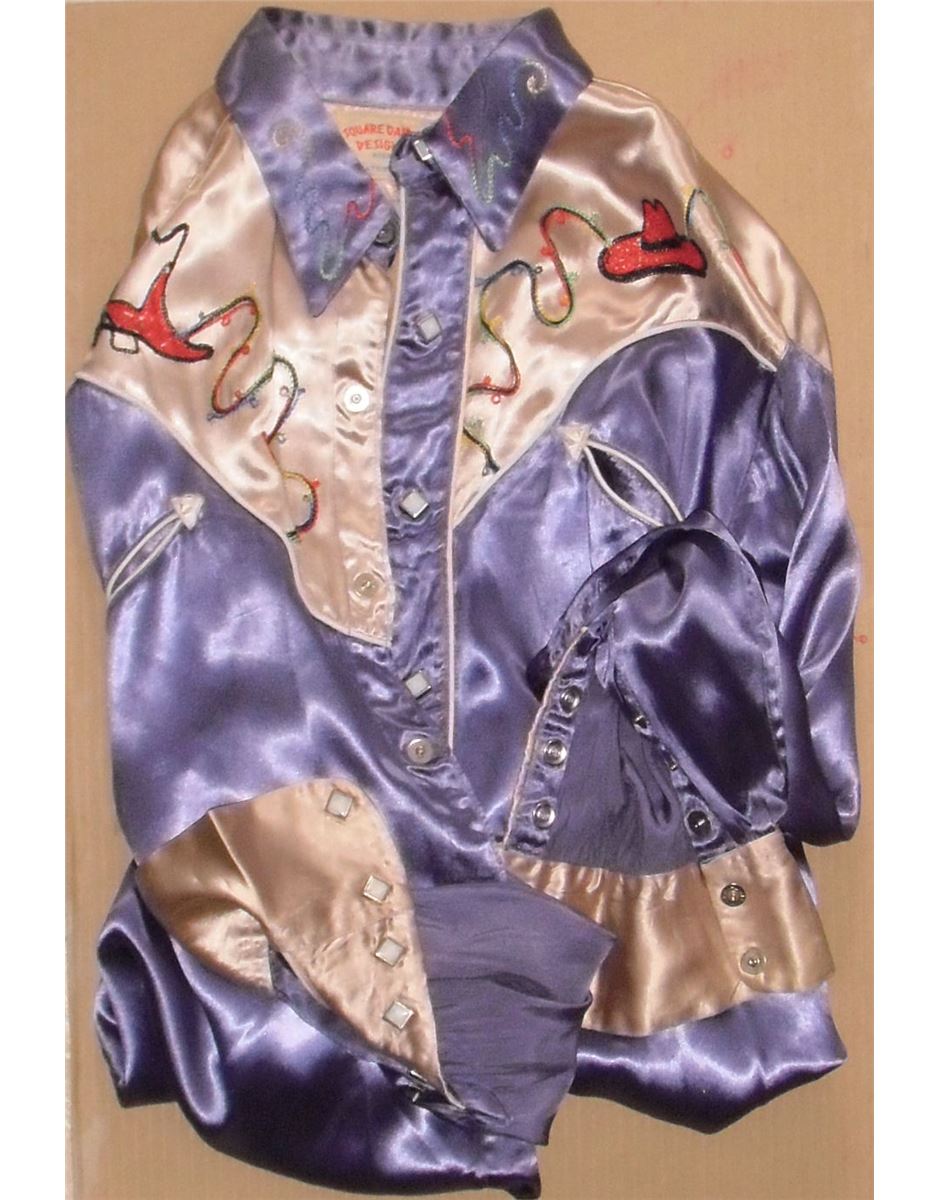 Old vintage impressive medium size 'Cowboy Western Shirt' by "Square Dance Designs Reg'd Created in Canada" still like new for its age and maybe never used so far, 2 arrow pockets and check out the snap exquisite buttons ; add to your collection or use now !