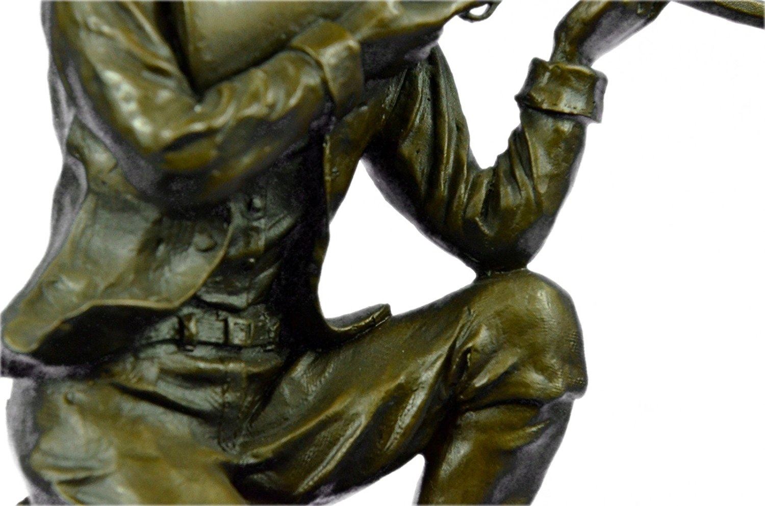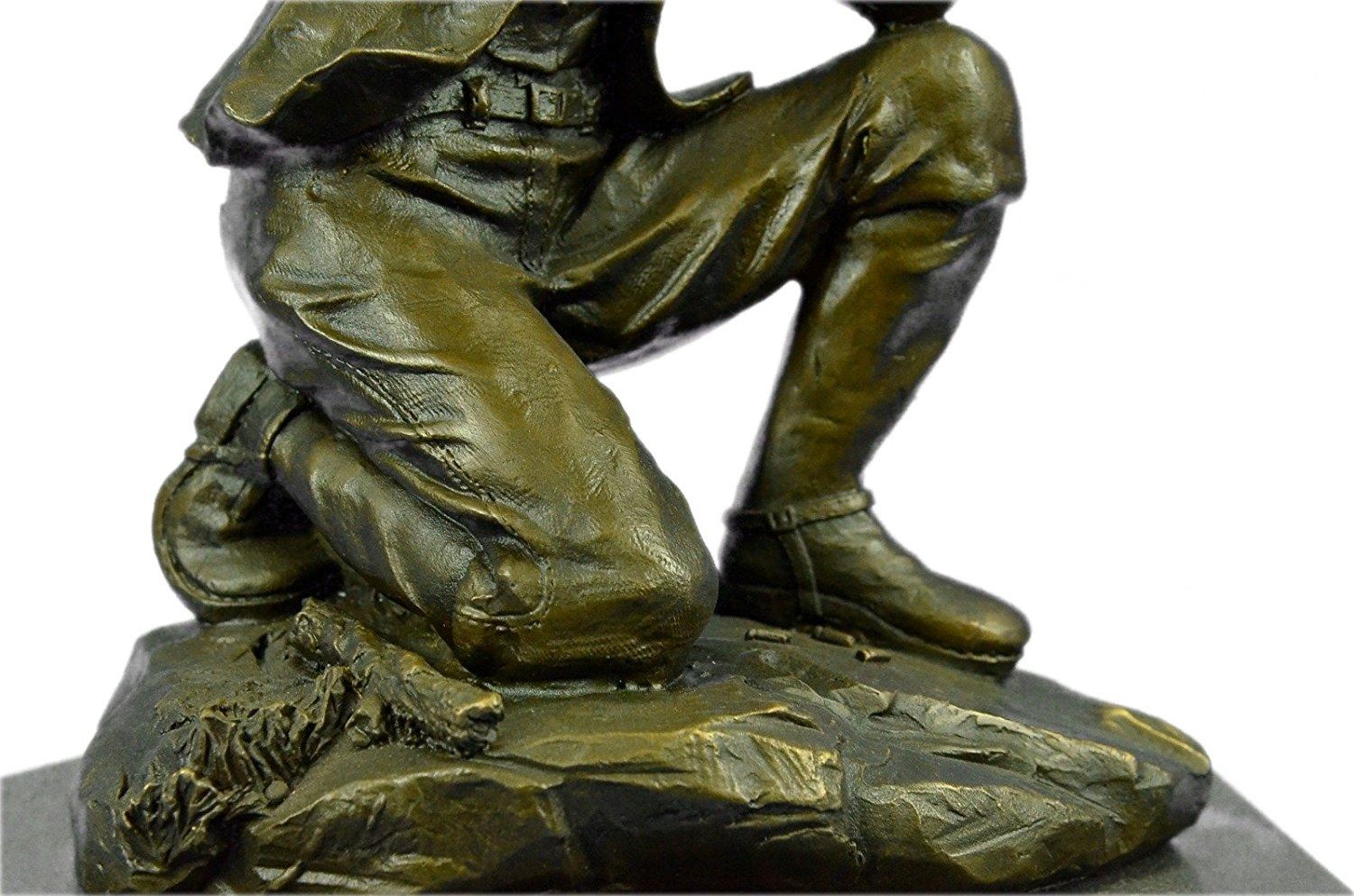 Here is a wonderful sculpture of a Cowboy shooting a rifle in the old west, in mid-run shooting range with his arch enemy. The detail of this statue is remarkable with the smaller detail of the hat, bullets on the floor and every little sculpted western image that make this a timeless figurine. This is a beautifully detailed sculpture and depicts the way of cowboy life as it should be. This sculpture was cast using the Lost Wax Method and has a brown patina. He is mounted on a marble base. Bronze Dimensions with Marble Base: Height 11 X Width 8 inches. Weight: 12 LBS. Inventory: 24YRD11874842