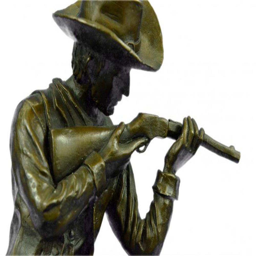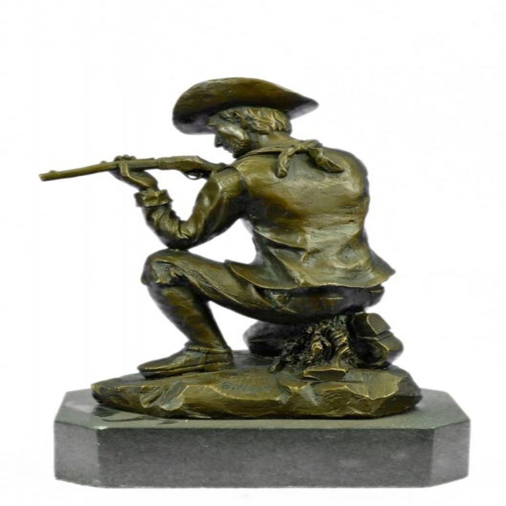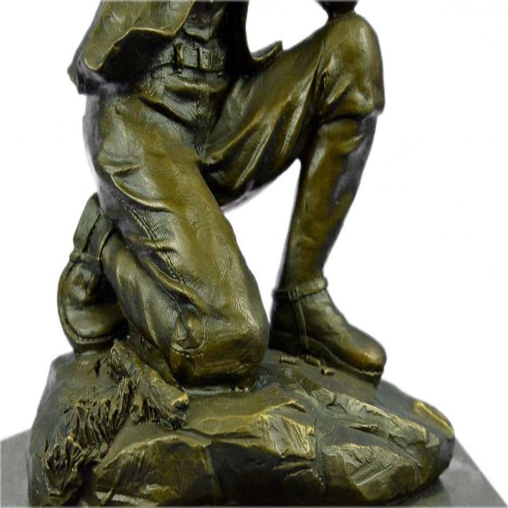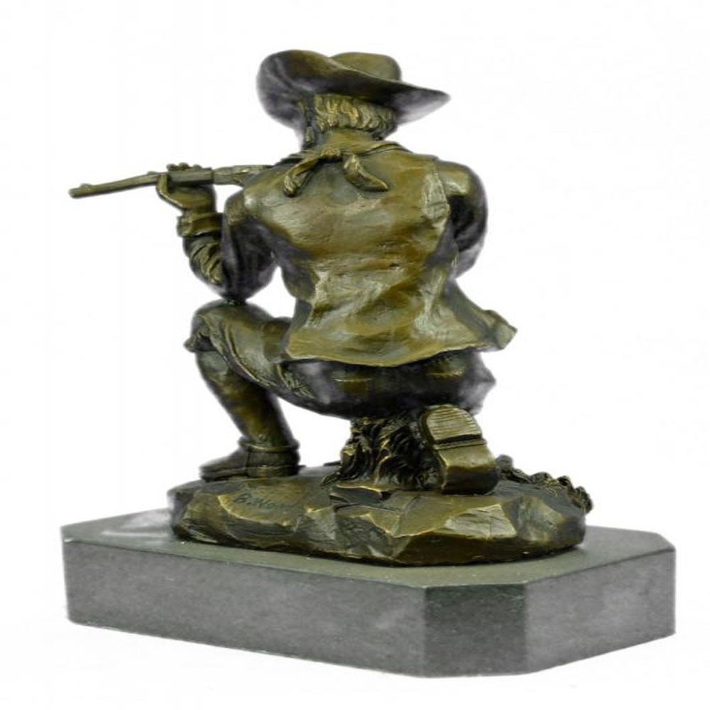 Here is a wonderful Sculpture of a Cowboy shooting a rifle in the old west, in midrun shooting range with his arch enemy. The detail of this Statue is remarkable with the smaller detail of the hat, bullets on the floor and every little sculpted western image that make this a timeless figurine. This is a beautifully detailed Sculpture and depicts the way of cowboy life as it should be. This Sculpture was cast using the Lost Wax Method and has a brown patina. He is mounted on a marble base. Bronze Dimensions with Marble Base: Height 11 X Width 8 inches. Weight: 12 LBS.