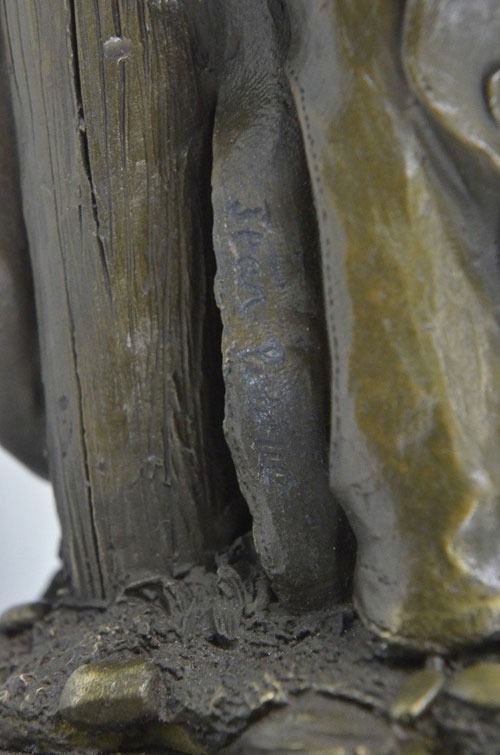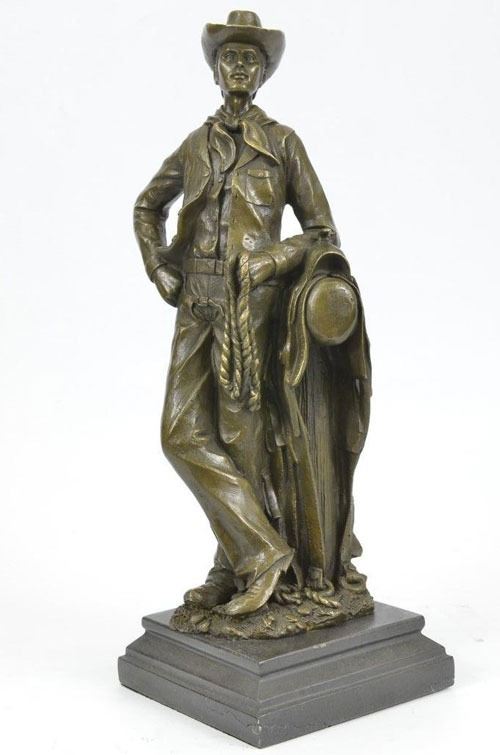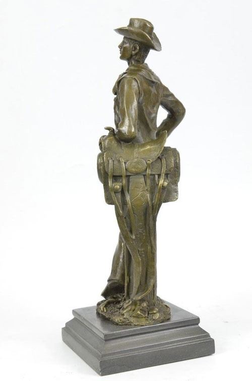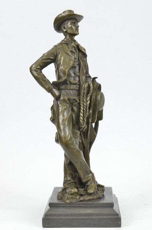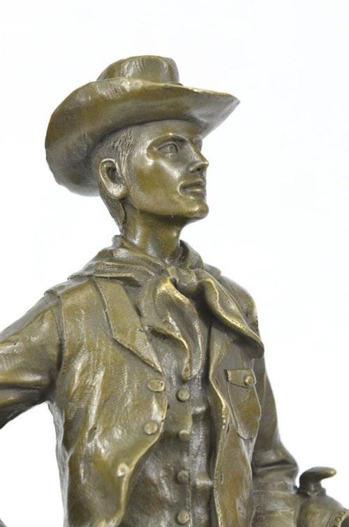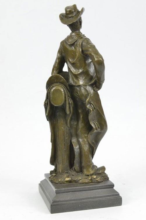 This is a sculpture of a classic cowboy. He wears his cowboy hat and his handkerchief loosely tied around his neck and holding a rope in his hand. On his feet her wears boots which his jeans cover in between his legs is a bunch of twigs that were gathered for fire. He looks off into the distance as if he heard something, on the other side of his hip he holds on to his knife. This is a beautifully detailed sculpture and depicts the way of cowboy life as it should be. This sculpture was cast using the Lost Wax Method and has a brown patina. He is mounted on a marble base. Bronze Dimensions with Marble Base: Height 14 X Width 6 inches. Weight: 11 LBS. Inventory: 57YRD11545475