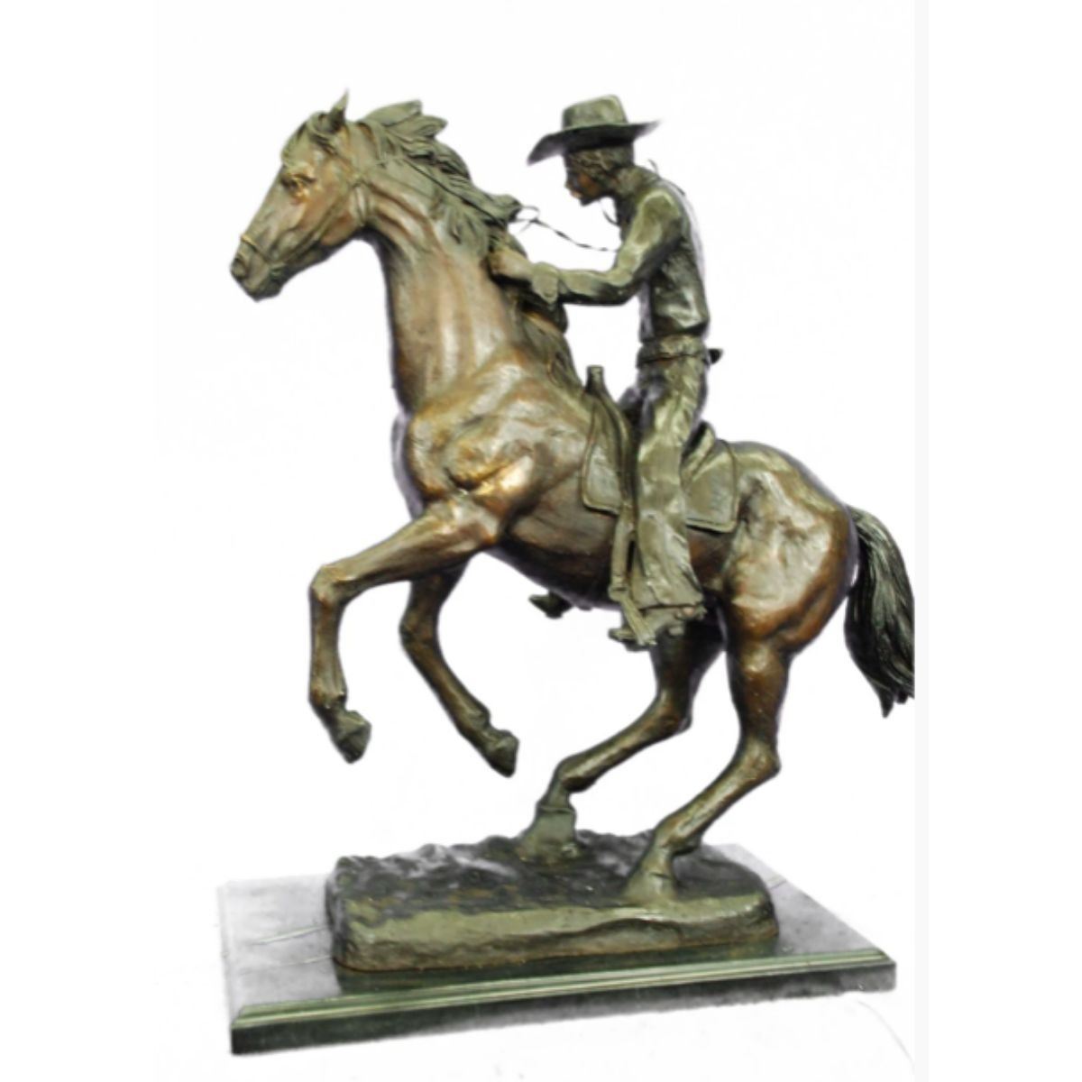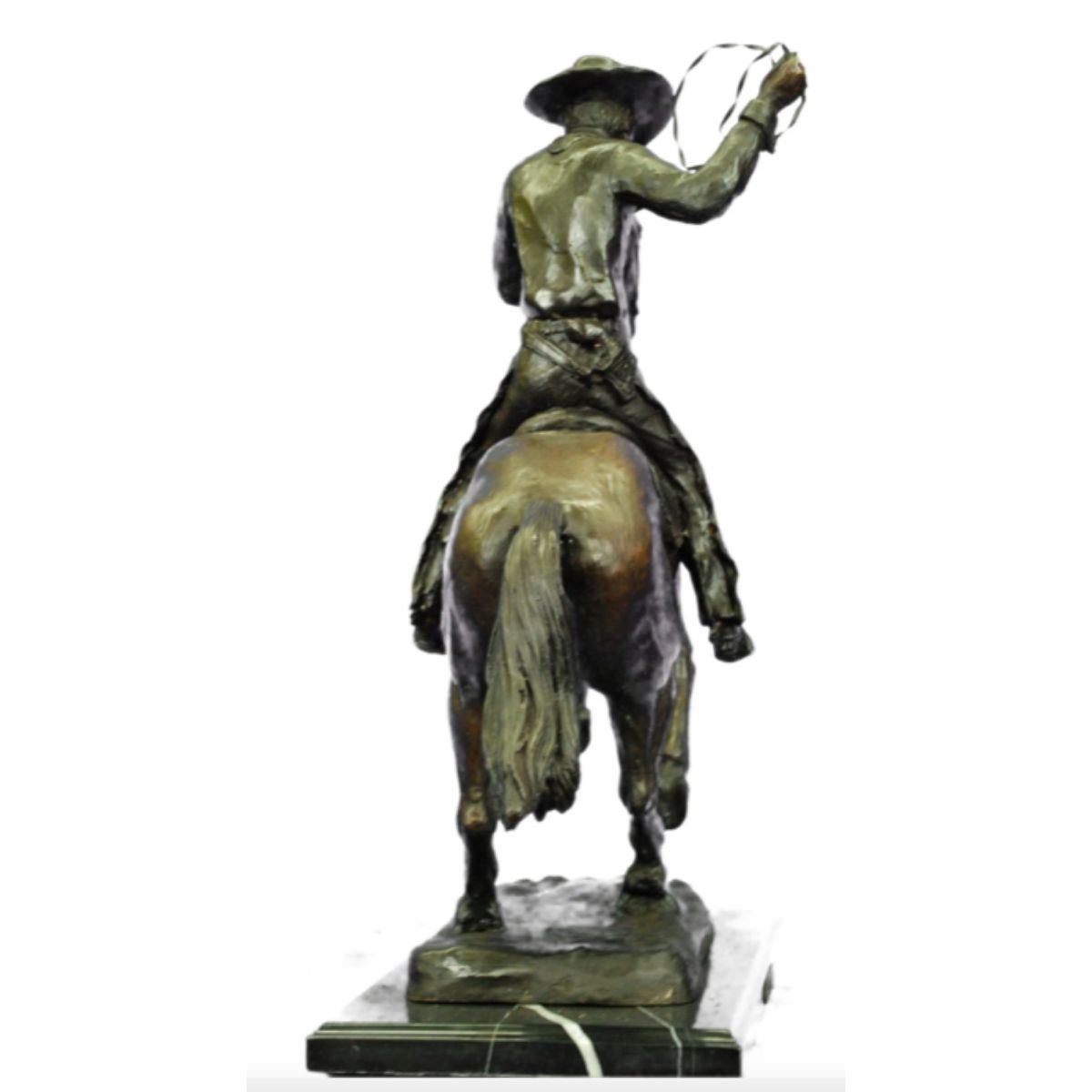 Cowboy With Rope Western sculpture. Lost wax casting method bronze, with brown patina, mounted on marble base. Signed by the artist C.M. Thomas at the base with gilt. 22" H X 24" W. 37lbs.