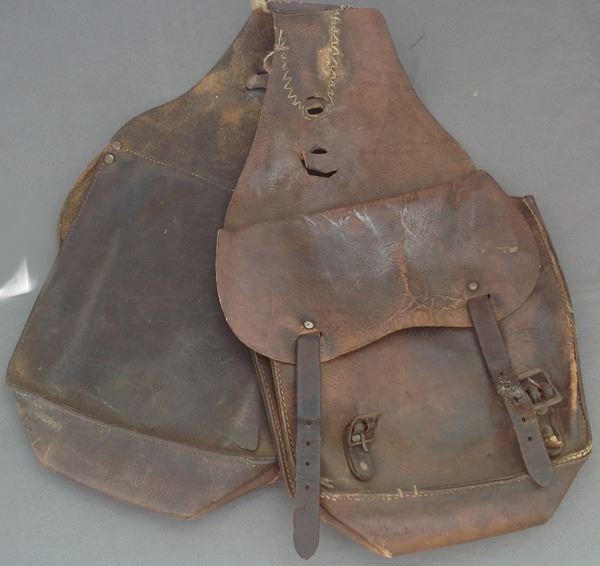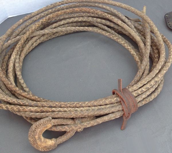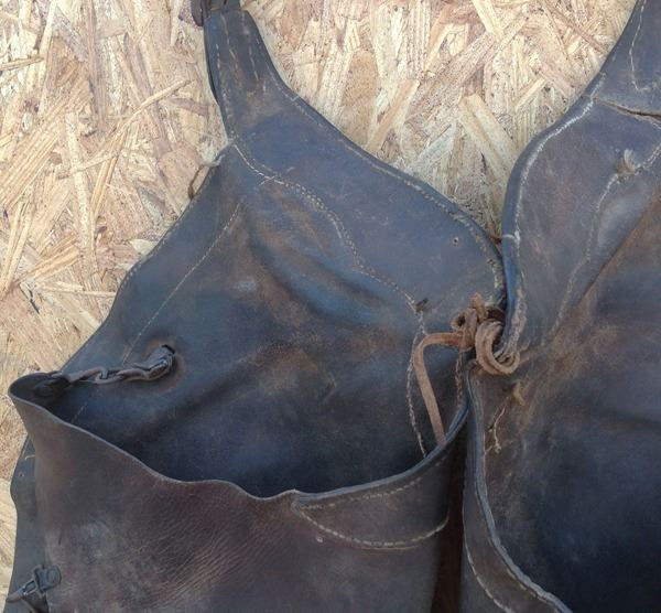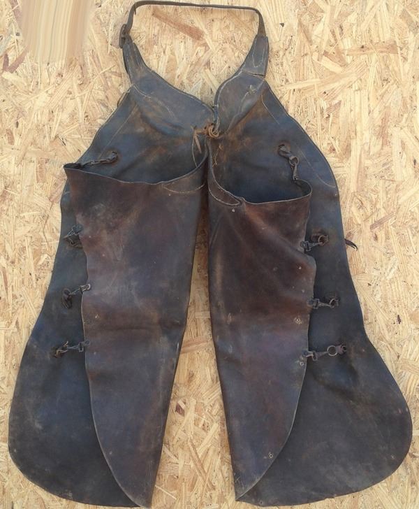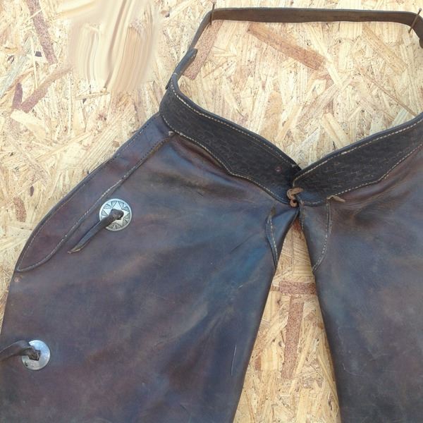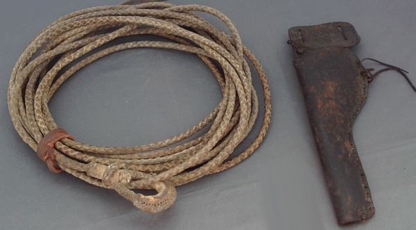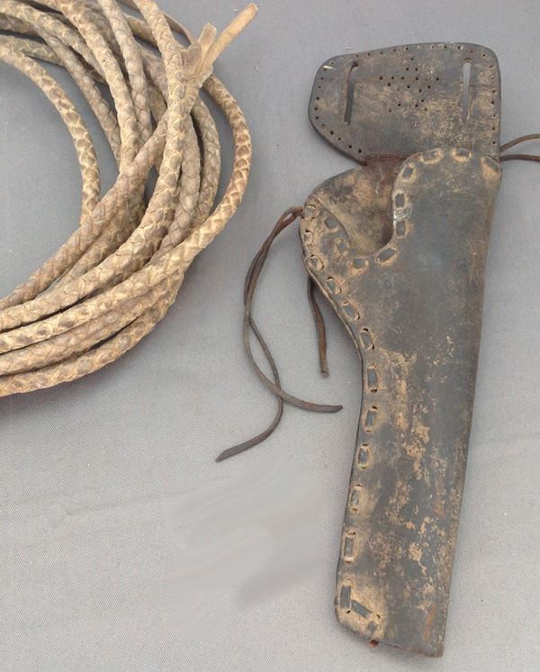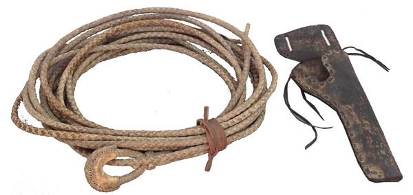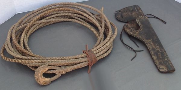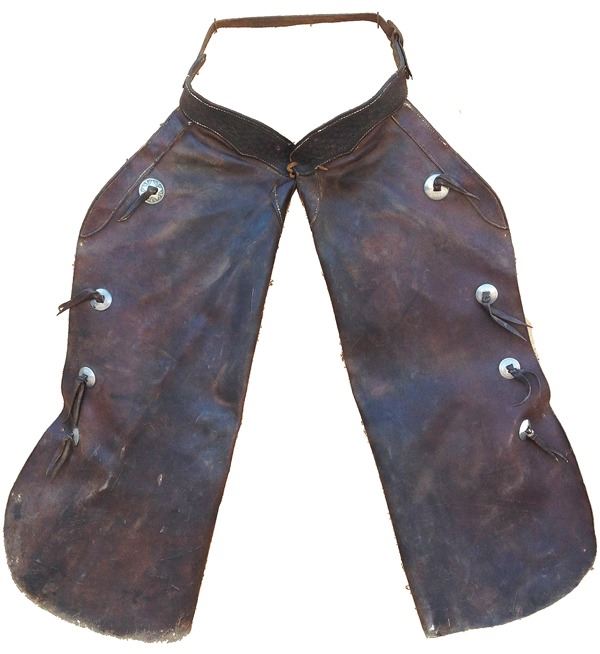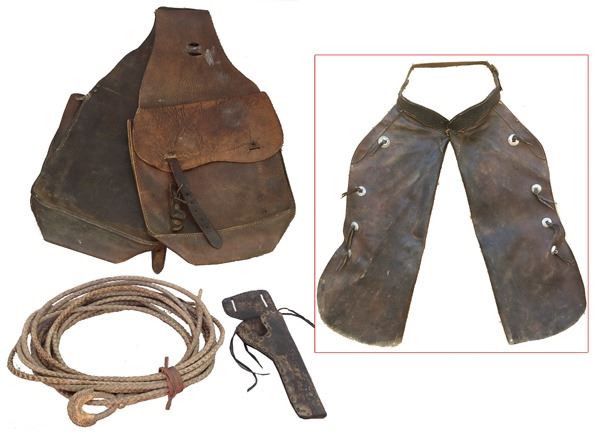 Early/Mid 1900s Adult Includes a great old pair of saddlebags, well used pair of batwing chaps, 35' rawhide riata, and an old leather holster, all from a ranch in Idaho. Good/Very good condition.