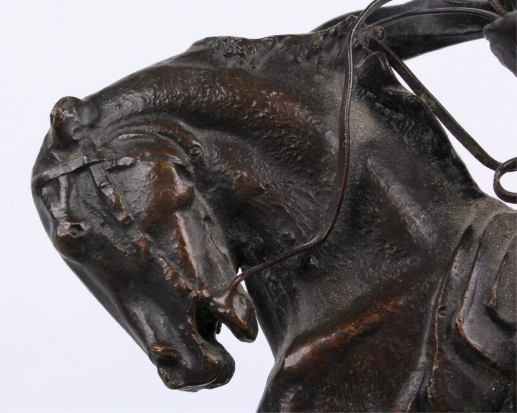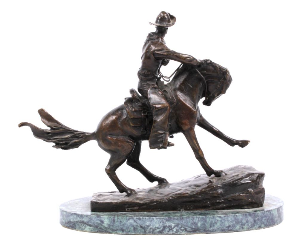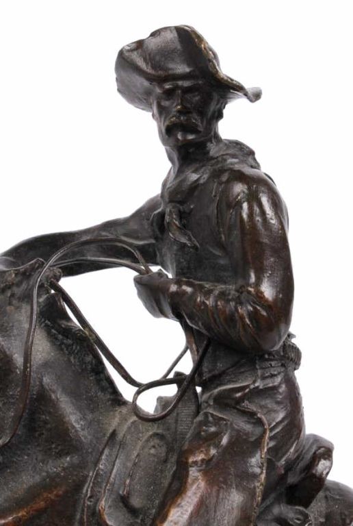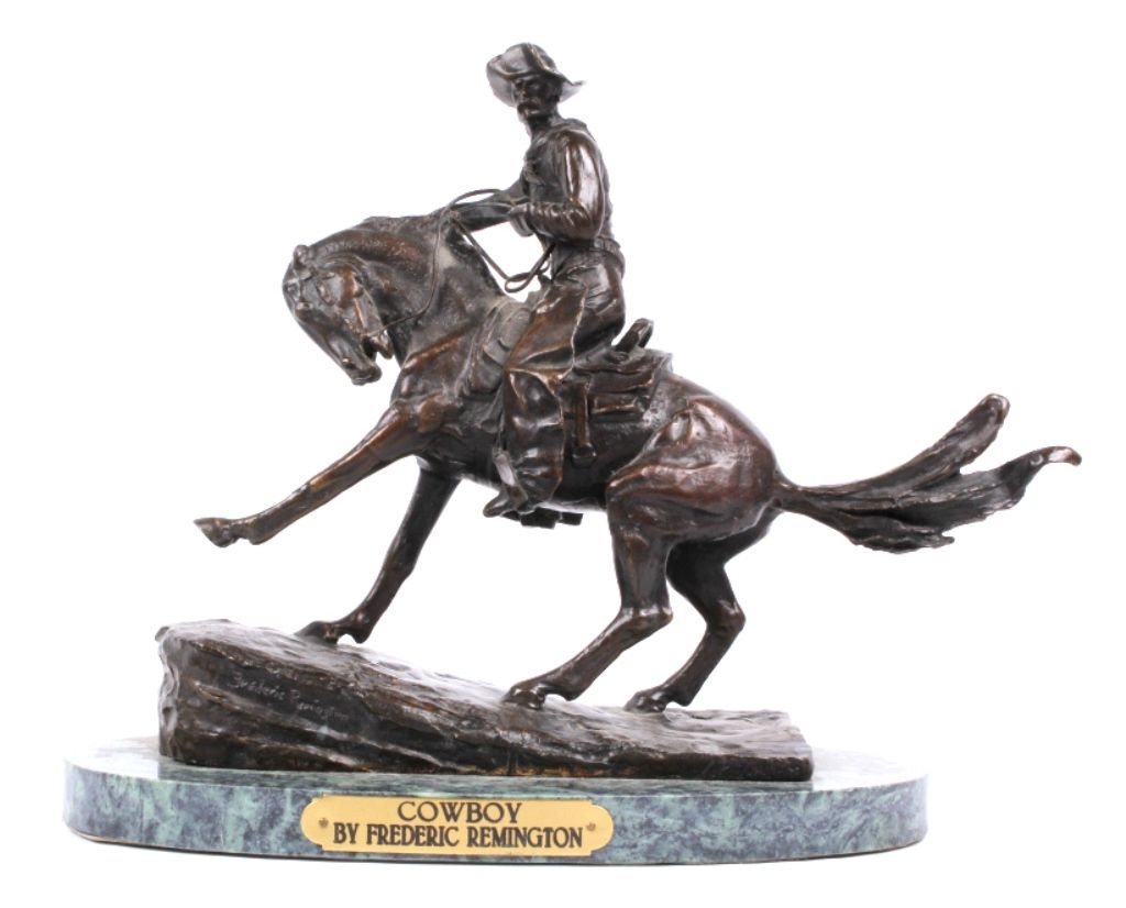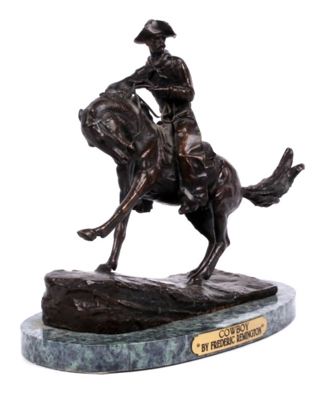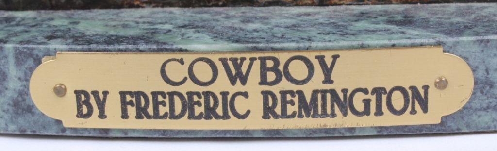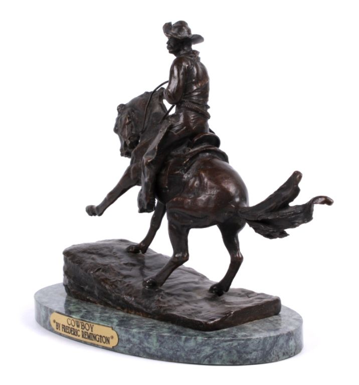 This is a solid Bronze casting done after Frederic Remington death (American, 1861-1909). This shows great details of a Cowboy on horse-back with his head turned. The piece is mounted to a marble base and is signed in the bronze, "Frederic Remington" and on the back, "(copyright symbol) ASB." Remington is one of the most notable and famous western artist and even the castings done after his death can be increasingly collectible. The artwork measures 10" tall and 6"x13"