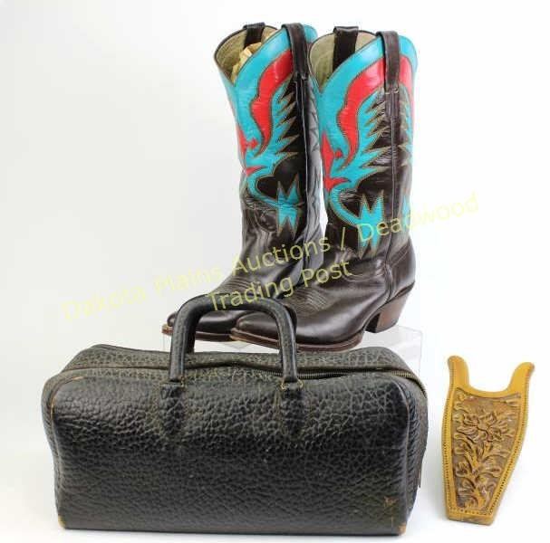 includes boot jack, vintage pair custom cowboy boots, doctors bag. Est. 75-125
