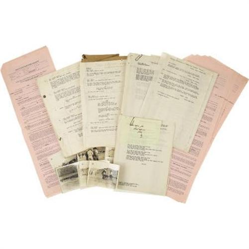 <B><I>Cowboy from Sundown</B></I></B></I> <B>Document Archive.</B></I> A set of documents from production on the 1940 Tex Ritter Western that includes 11 b&w snapshots taking during filming (including a few of Ritter roping cattle), 13 Screen Actors Guild contracts for various supporting players, song lyrics, a dialogue continuity script, a dialogue script for a promotional trailer, a copy of the screenplay, and other items from the production. In overall Fine to Very Fine condition with some wear. <I>Accompanied by a COA from PSA/DNA.</B></I><BR><BR><b>Shipping:</b> Books & Catalogs (<a target="_blank" href="http://www.heritageauctions.com/common/shipping.php">view shipping information</a>)