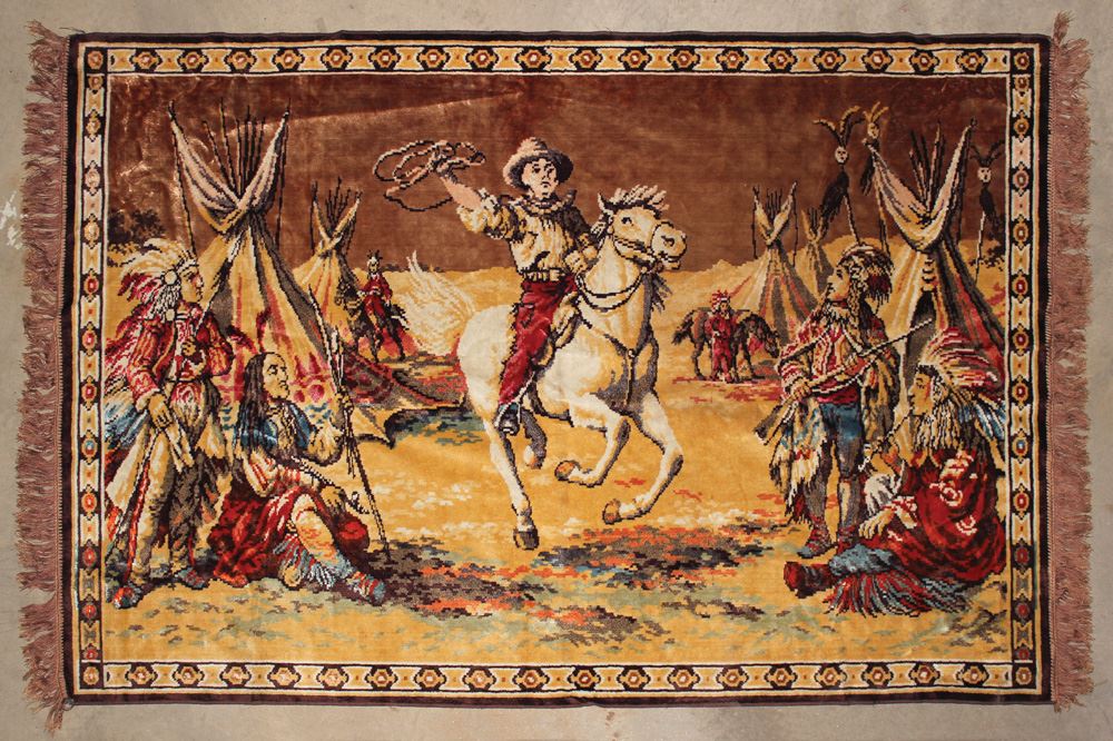 Unique tapestry wall hanging with fantastic western scene measuring 48" x 75".