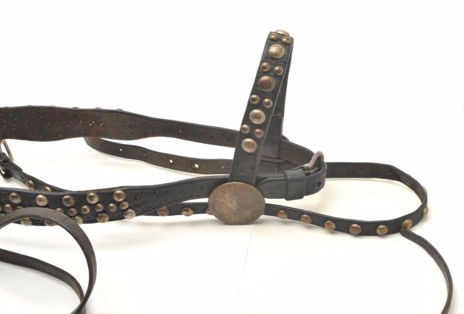 Cowboy studded headstall with Visalia “Humane” polo style bit with conchos and decoration. Great decorator bit circa 1930s-40s. Headstall 1910-30s. Est.: $400-$800