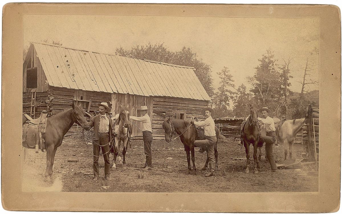 Original circa 1880–1890 mounted 7.5 x 4.5 boudoir card photograph of four cowboys beside their saddled horses, posing in front of a ramshackle homestead. In fine condition.
