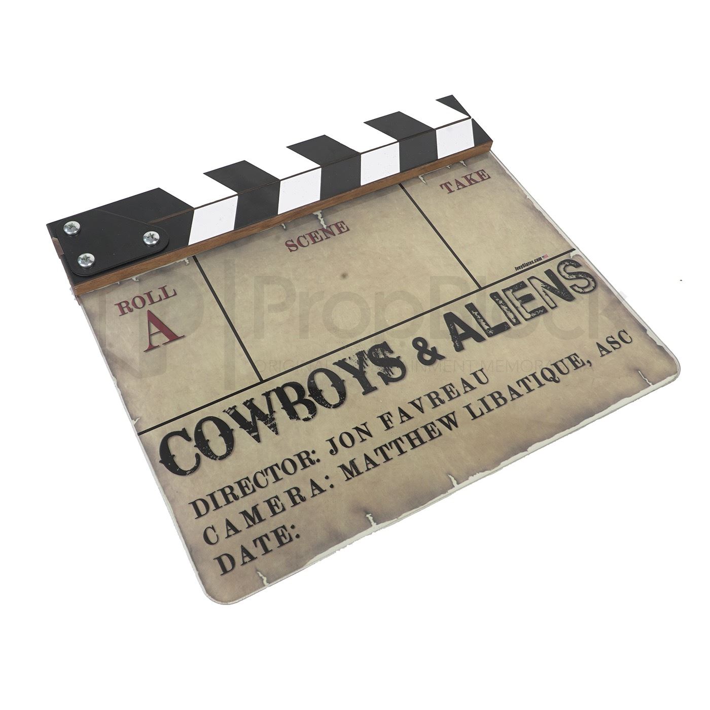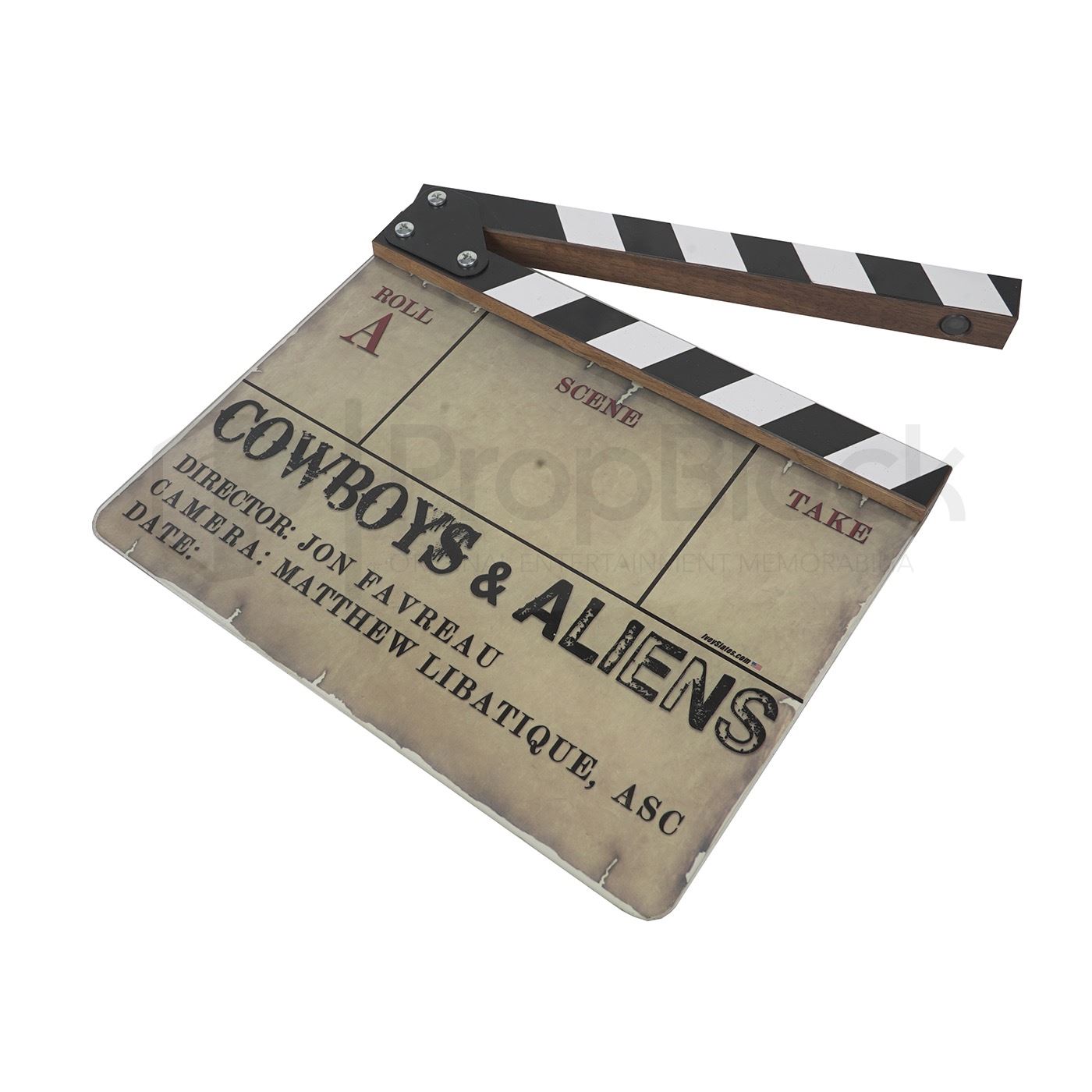 Promotional clapperboard given out to members of the cast and crew during wrap of the 2011 science fiction film Cowboys vs. Aliens. Bearing a mysterious metal shackle on his wrist, an amnesiac gunslinger (Daniel Craig) wanders into a frontier town called Absolution. He quickly finds that strangers are unwelcome, and no one does anything without the approval of tyrannical Col. Dolarhyde (Harrison Ford). But when Absolution faces a threat from beyond Earth, the stranger finds that he is its only hope of salvation. He unites townspeople, outlaws and Apache warriors against the alien forces in an epic battle for survival. These were given to a very few select cast and crew members after filming. This piece is made of acrylic with a wooden clapper and printed details featuring the title of the film. This piece remains in excellent, production used condition.