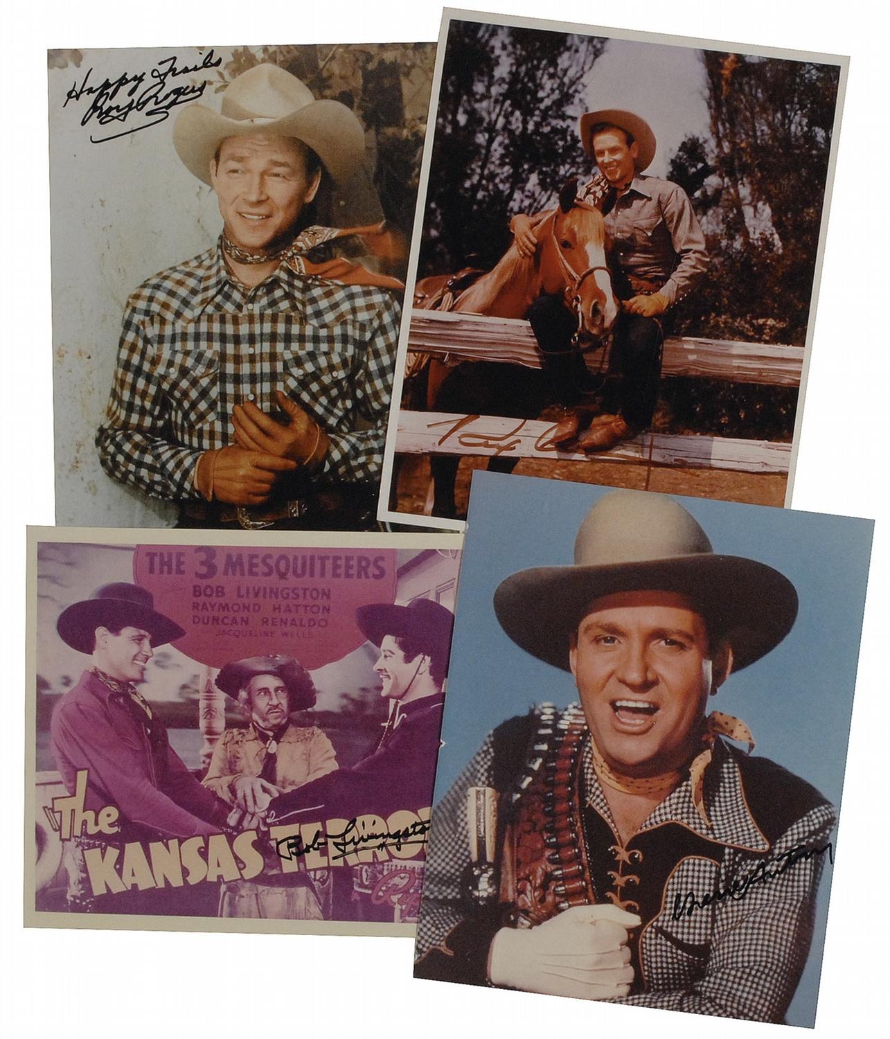Four items: three color glossy 8 x 10 photos of Roy Rogers, Gene Autry, and Rex Allen, individually signed in black felt tip by each cowboy with Rogers adding “Happy Trails”); and a color glossy 10 x 8 photo of a Kansas Terrors lobby card signed in black felt tip by Bob Livingston. In overall fine condition.