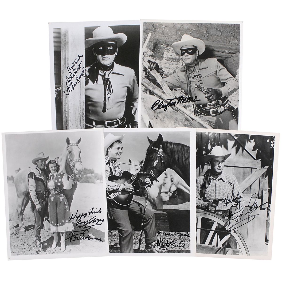 Five different glossy 8 x 10 photos, each signed in felt tip by the star pictured. Signers are: Roy Rogers (adding “Happy Trails”) and Dale Evans; Clayton Moore; John Hart (adding “Best wishes, ‘The Lone Ranger’”); Monte Hale; and Rex Allen (adding “Howdy”). In overall fine condition.