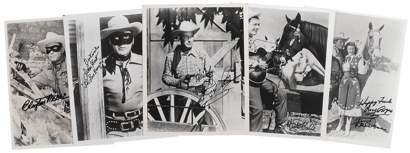 Five different glossy 8 x 10 photos, each signed in felt tip by the respective star pictured. Signers are: Roy Rogers (adding “Happy Trails”) and Dale Evans, Clayton Moore, John Hart (adding “Best wishes, ‘The Lone Ranger’”), Monte Hale, and Rex Allen (adding “Howdy”). In overall fine condition.
